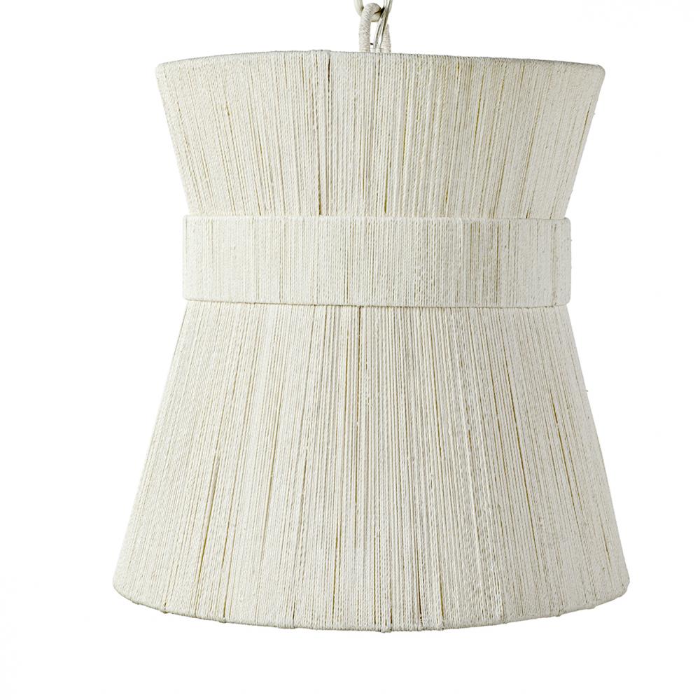 White abaca rope finely woven over a powder coated metal frame. Pendant comes with an off-white finished metal chain and canopy hanging kit. Professional installation recommended.