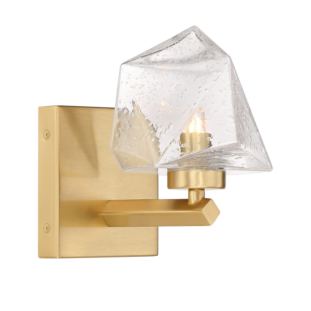 The Castello 1-light sconce from Savoy House is cool as ice! Its sharply cut shade of clear hammered glass adds a bright touch of geometry and texture, pairing perfectly with the thick arm and backplate that is finished in Warm Brass. Castello is 6.5" in height, 5" in width and extends 6.5" from the wall. Uses one LED G9 bulb. Bulb not included.