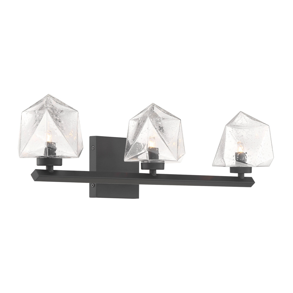 The Castello 3-light bath light from Savoy House is cool as ice! Its sharply cut shades of clear hammered glass add a bright touch of geometry and texture, pairing perfectly with the thick arm and backplate that is finished in Black. Castello is 6.5" in height, 25" in width and extends 6.5" from the wall. Uses three LED G9 bulbs. Bulbs not included.