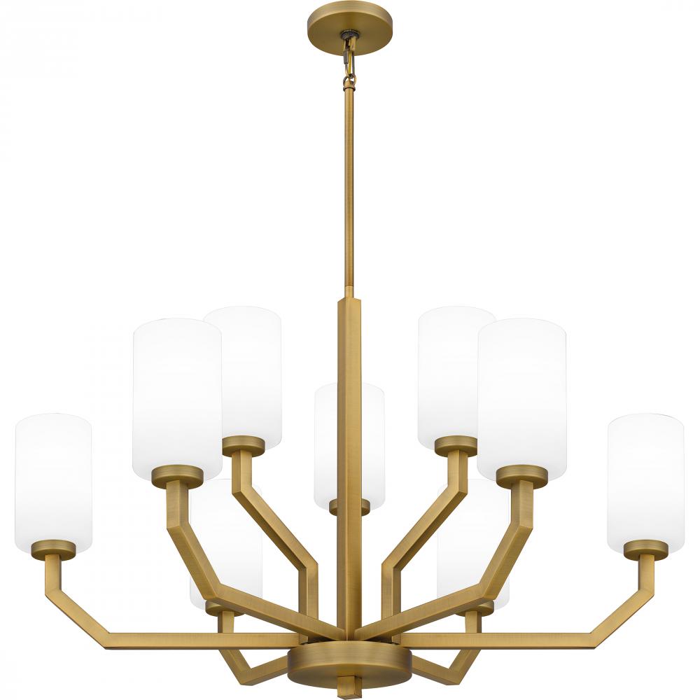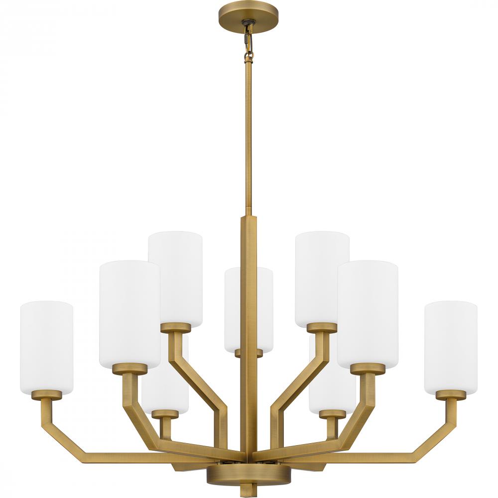 Modern art meets functional lighting in Cavalier. Soft opal glass shades rest atop sculptural, slightly bending arms for a geometric yet sophisticated feel. The aged brass finish adds a beautiful luster, making the Cavalier chandelier a perfect statement p