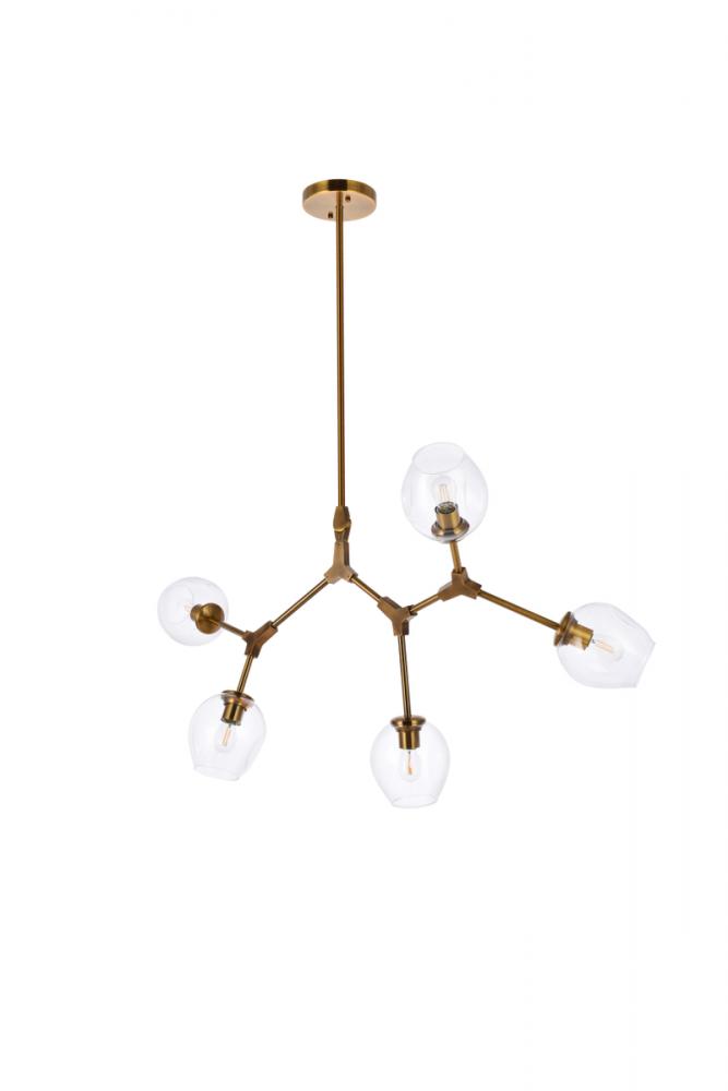 The daring Cavoli pendant lamp in a brass finish is designed with 5 lights that connect at various angles, illuminating your rooms and ridding them of darkness. The winding paths end with a light encapsulated within a clear shade at each point. This contemporary blend of art and function results in this light that will shine beautifully in any space it adorns.
