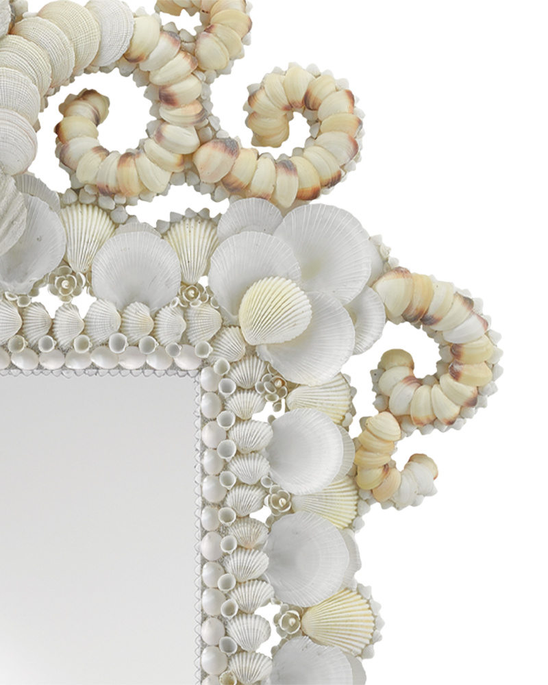 As if it rose on a mighty wave emanating from Atlantis, the beautiful Cecilia Mirror grandly ornaments the space it occupies with its hand-applied mix of shells forming flourishes that make the decorative mirror seem as if its sprouting oceanic movement. Natural shells are affixed to a white frame to form this marvel of a mirror. It comes with a cleat for hanging vertically.