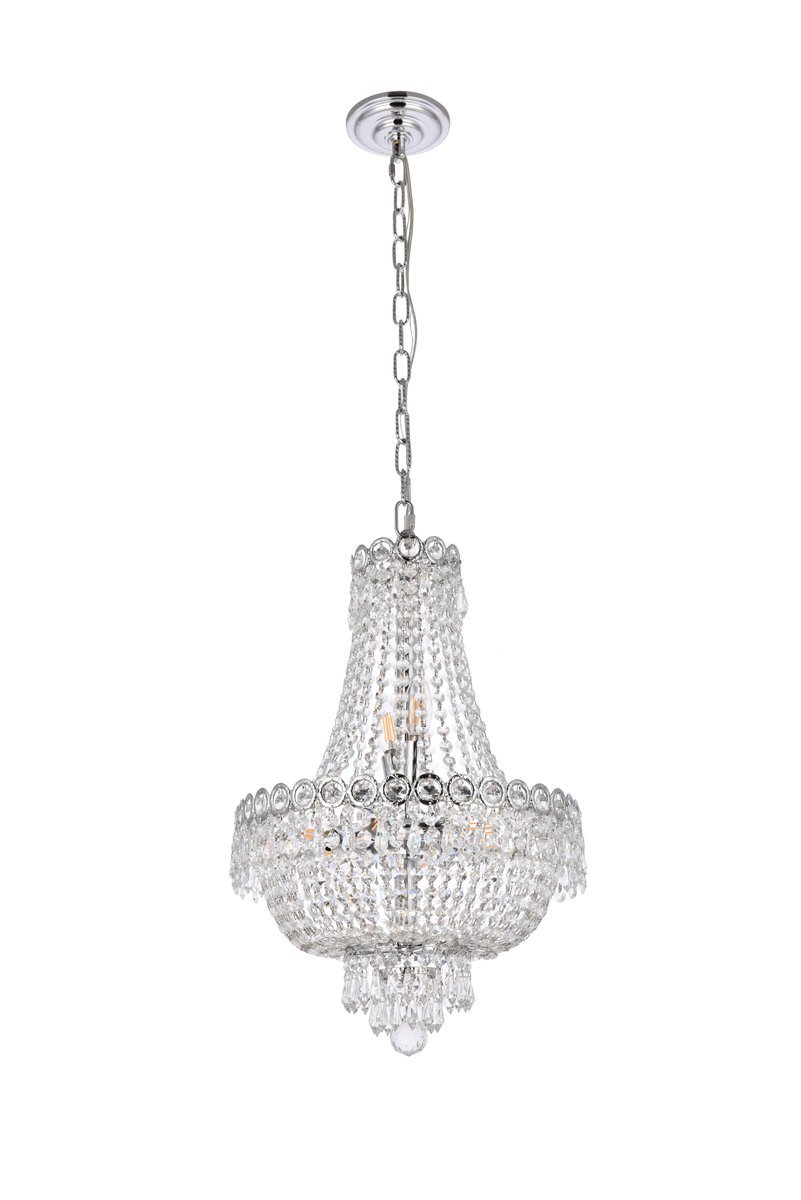 The exquisite Century collection was inspired by the classic allure of 19th-century France. These opulent chandeliers and pendant lamps are highlighted by delicate lines of light-refracting crystals gently flowing down into a bell shape. Each layer is banded with crystal octagons and spear-shaped drops, with the extravaganza coming together at the bottom with a Single crystal ball or a shell completely covered in clear spherical crystal balls. This masterpiece is available in a variety of crystal trims. A column of chrome or gold inside supports soft-glowing candelabra bulbs, creating an effulgence that peeks out between the strands of crystals.