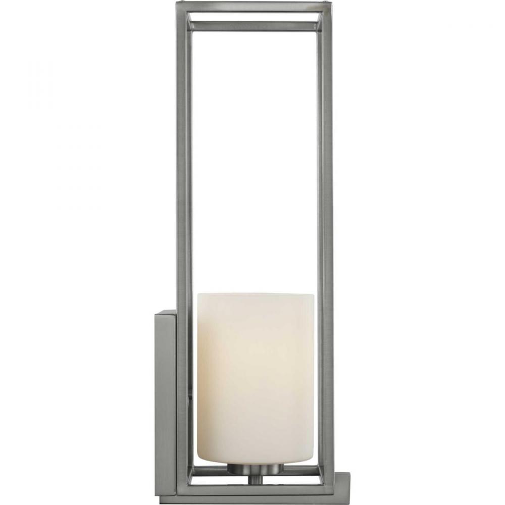 Stick with simple geometric forms and clean crisp lines with this modern wall bracket. A beautiful opal glass shade visually calms the sharp edges of the boxy frame in a masterful stroke of design excellence. The frame is coated in a classic brushed nickel finish that contrasts the light shade. The light fixture is just right for spaces in need of a subtle, feminine touch.