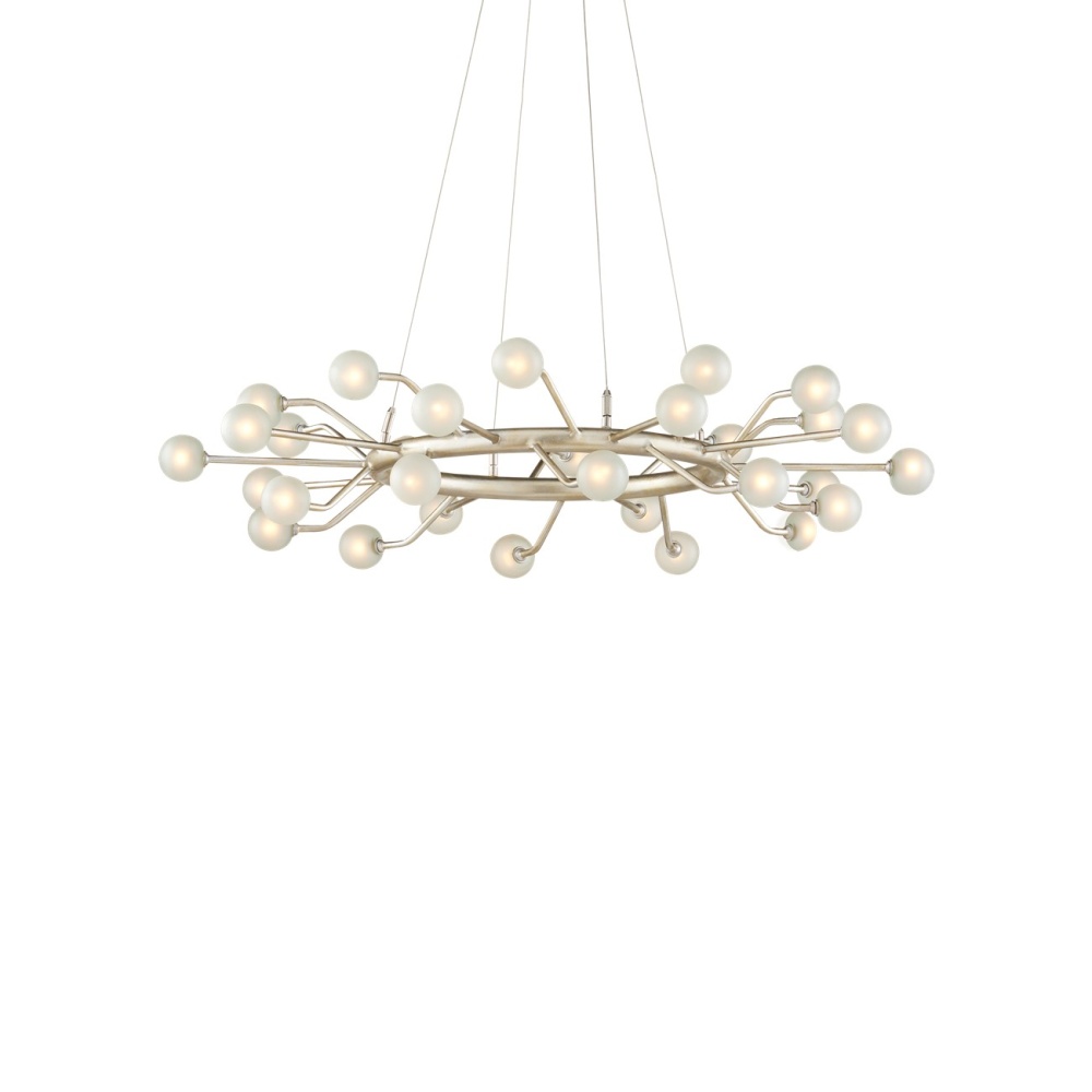 The Chaldea Chandelier has a space-age appeal with its arcing arms that hold frosted globes. These are made of recycled glass and fitted with LED bulbs to make it an environmentally conscious design with planetary aspirations. The metal is in a contemporary silver leaf finish and the fixture is hung on aircraft cable, both coalescing to bring a lightness to this silver chandelier. Adjustable from 14" to 125" with use of included chain/rod kit/cable. If your space calls for a longer drop, additional chain/rods/cable is available for purchase.