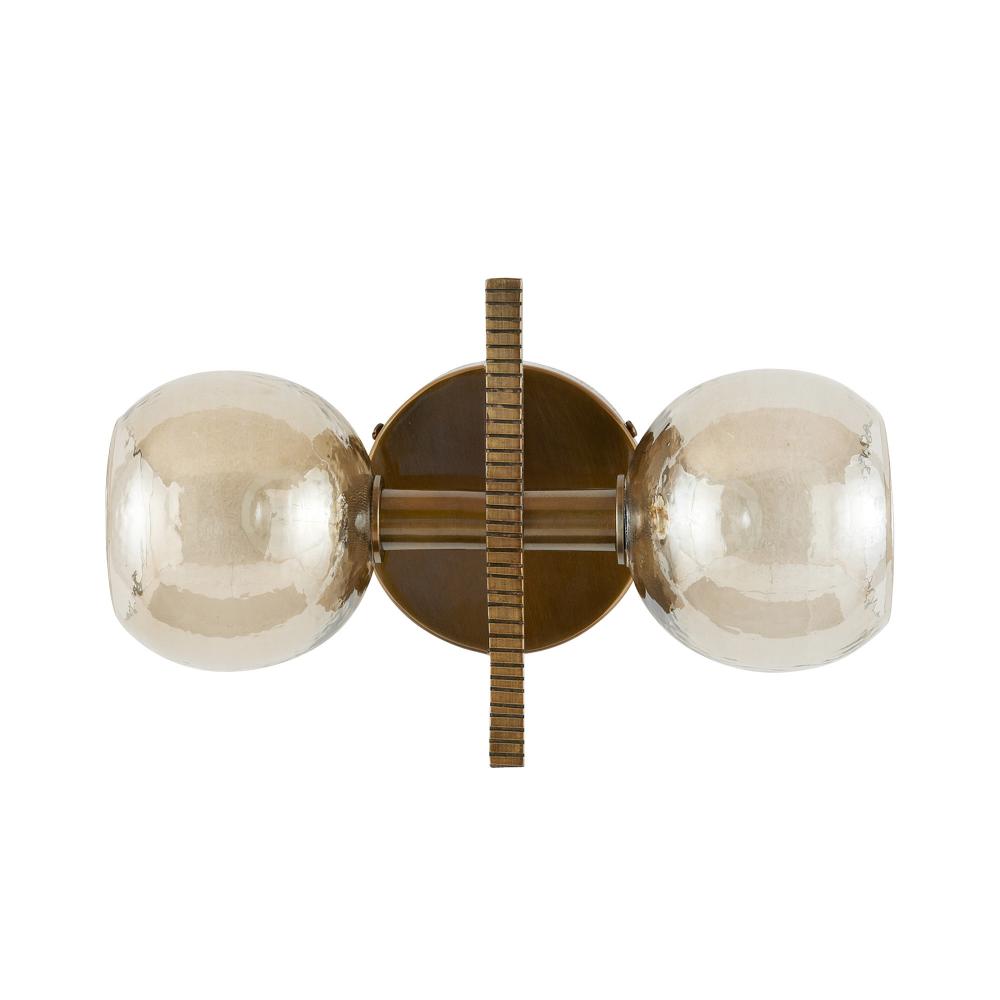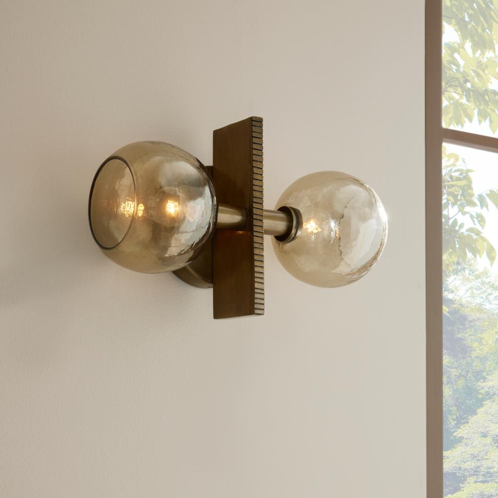 Easily placed horizontally or vertically, the Chamberlin is at home in a contemporary or industrial setting. Offering an alluring mix of antique brass-plated iron hardware and smoke luster glass, two globe lights are contrasted with a textural bar detail at the center. Finish will vary.