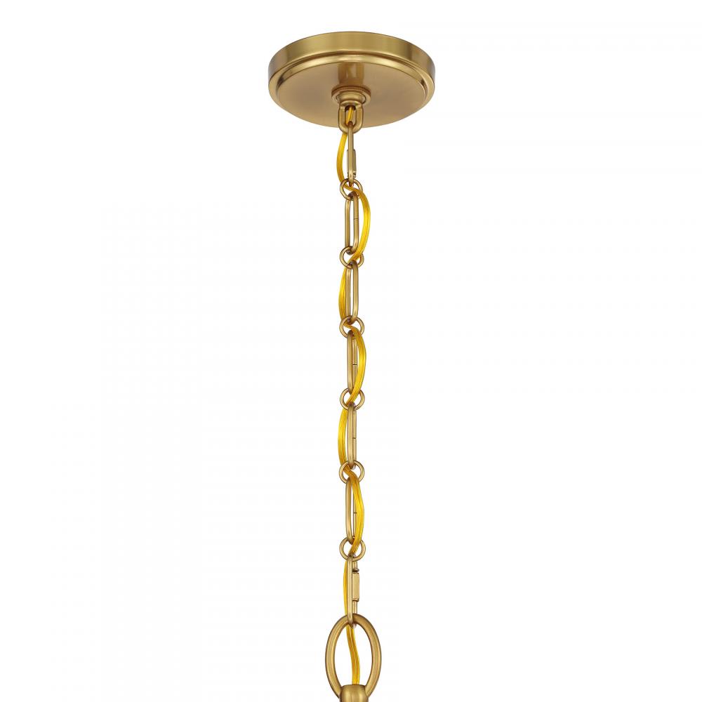 A timeless lighting look is freshened up with chic K9 crystal accents in the Savoy House Champlain 5-light chandelier. The simple elegance makes it a stylish selection for adding a touch of brightness to any room and the Warm Brass finish pairs perfectly with the K9 crystal. Champlain is 23.5" in height and 28" in width. It uses five candelabra size bulbs of up to 60 watts per bulb. Bulbs not included. Comes with 120" of chain.