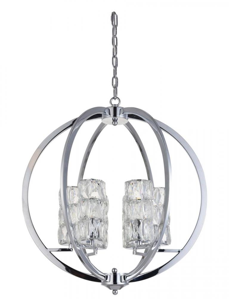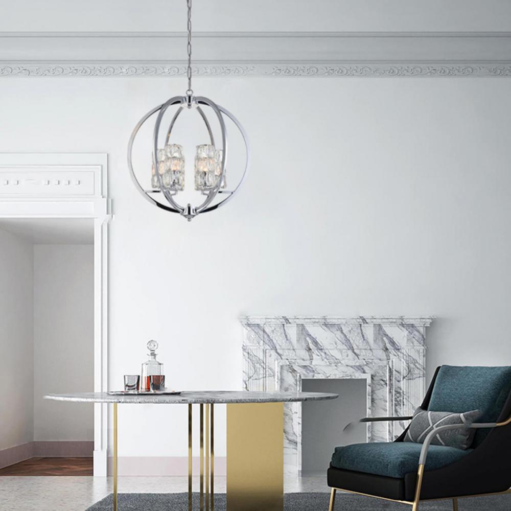 This modern chandelier is in a chrome finish. It comes with crystal shades in clear color. The shape of this fixture is ORB.