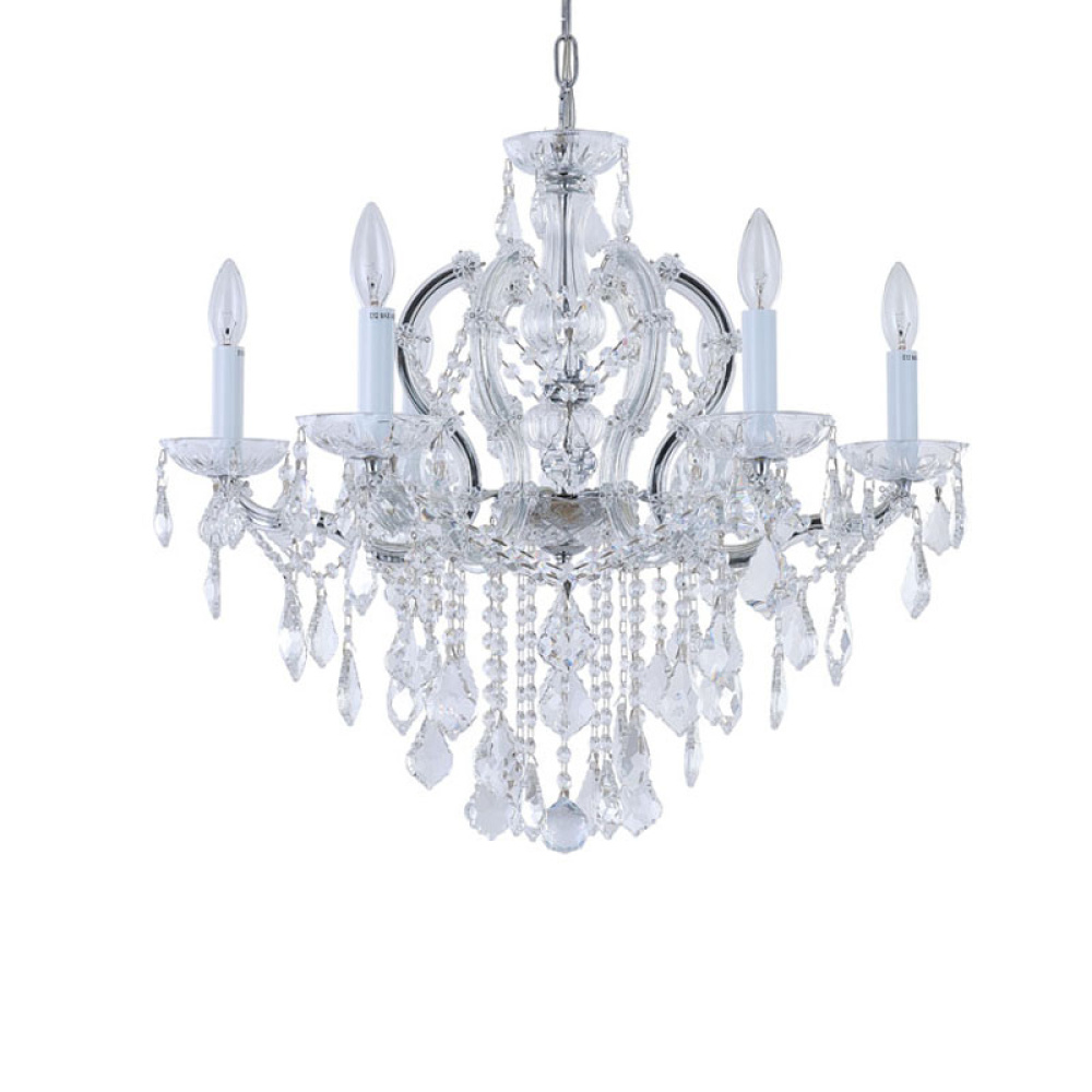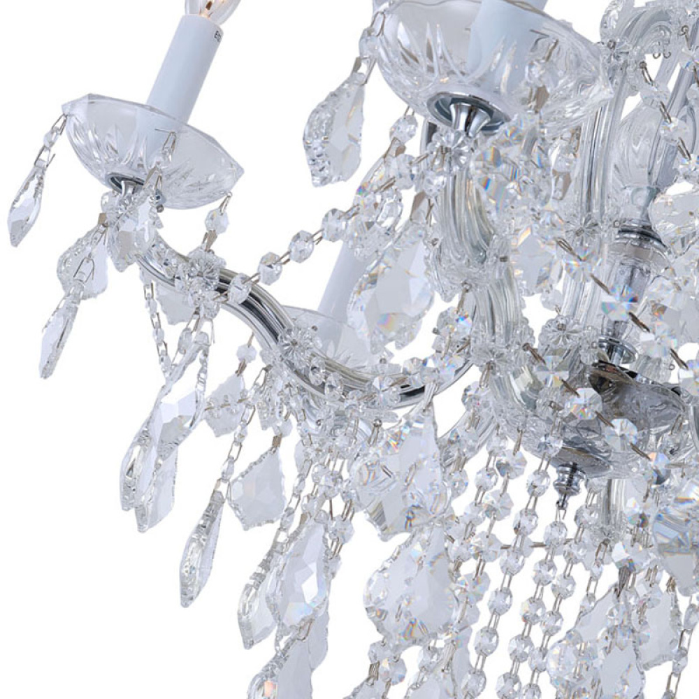 This exquisite chandelier is in a chrome finish. The frame is made out of metal, and it comes with beautiful crystal accents in clear color. The adjustable chain link makes this fixture suitable for most ceiling height.