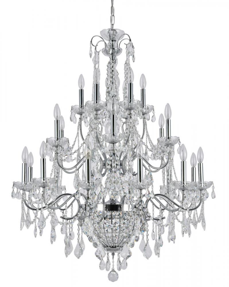 This three-tier chandelier has a chrome metal frame