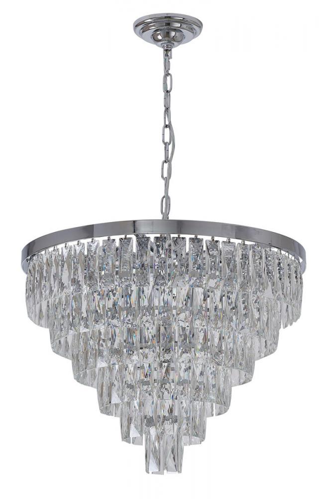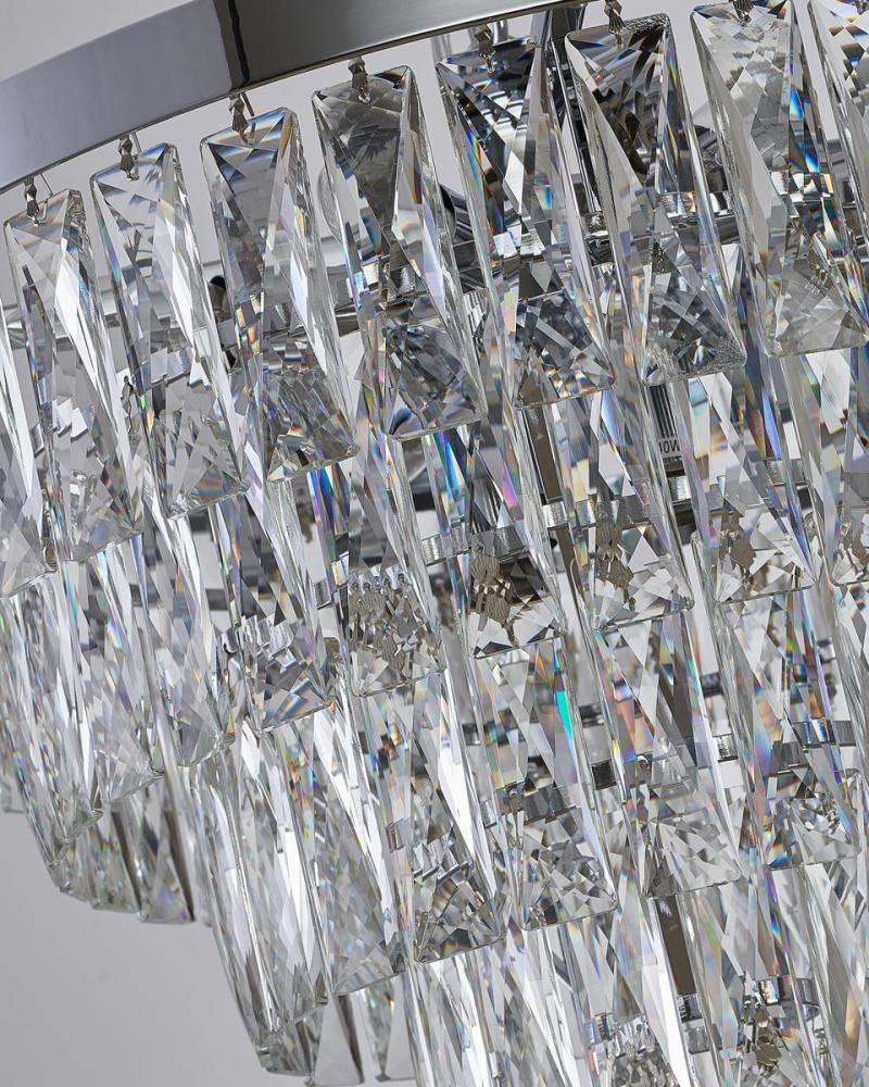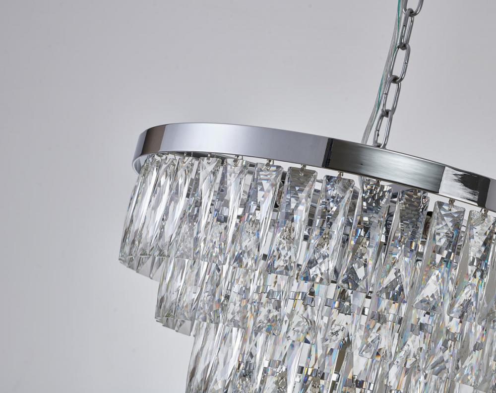 This chandelier has six tiers in a round shape, the frame is made out of metal in a chrome finish. It comes with clear hanging crystal accents. The adjustable chain link makes this chandelier suitable for most ceiling heights.