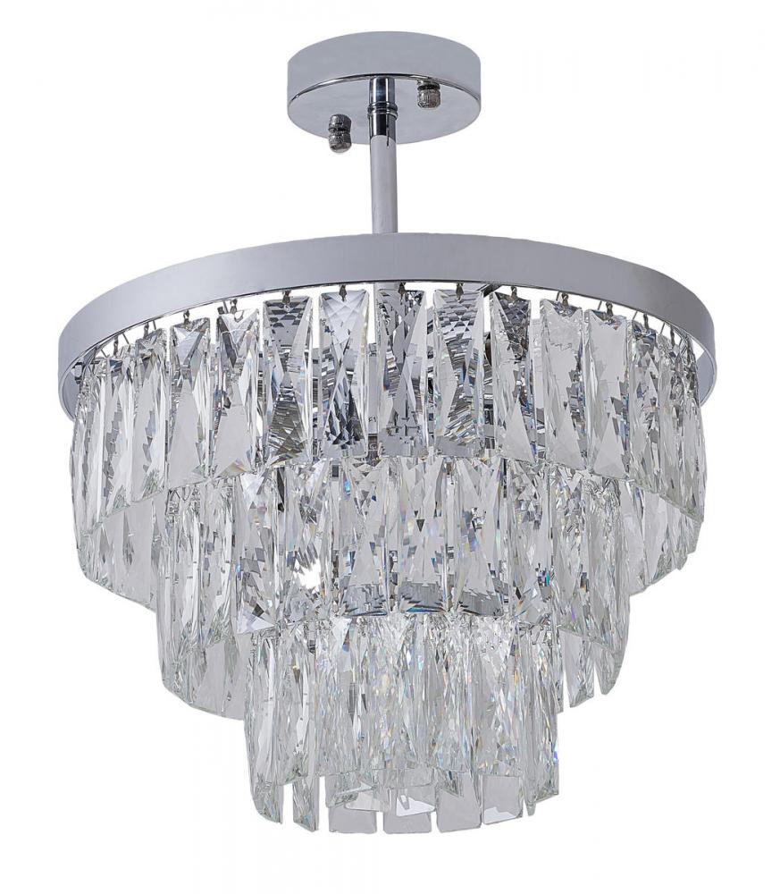 This chandelier has three tiers in a round shape, the frame is made out of metal in a chrome finish. It comes with clear hanging crystal accents. The adjustable chain link makes this chandelier suitable for most ceiling heights, and it also can be hung as a semi flush mount.