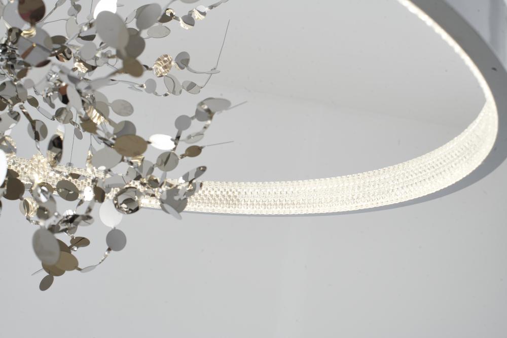 This chandelier is in a chrome finish. It comes with a chrome stainless steel confetti interior and a transparent diffuser. The cord length of 78 inches is provided and the cord length is adjustable.