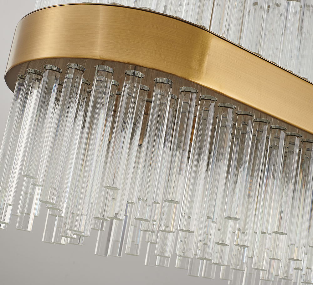 This exquisite chandelier is in a gold finish. The frame is made out of metal in an oval shape, and it comes with glass rods in clear color. The adjustable rod links make this fixture suitable for most ceiling heights.
