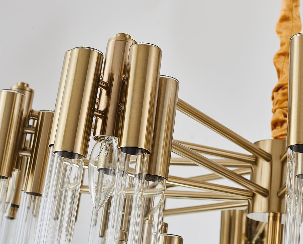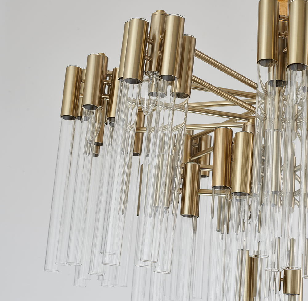 This three tier chandelier has a gold metal frame. It comes with glass tube rods in clear color. The adjustable chain link makes this fixture suitable for most ceiling heights.