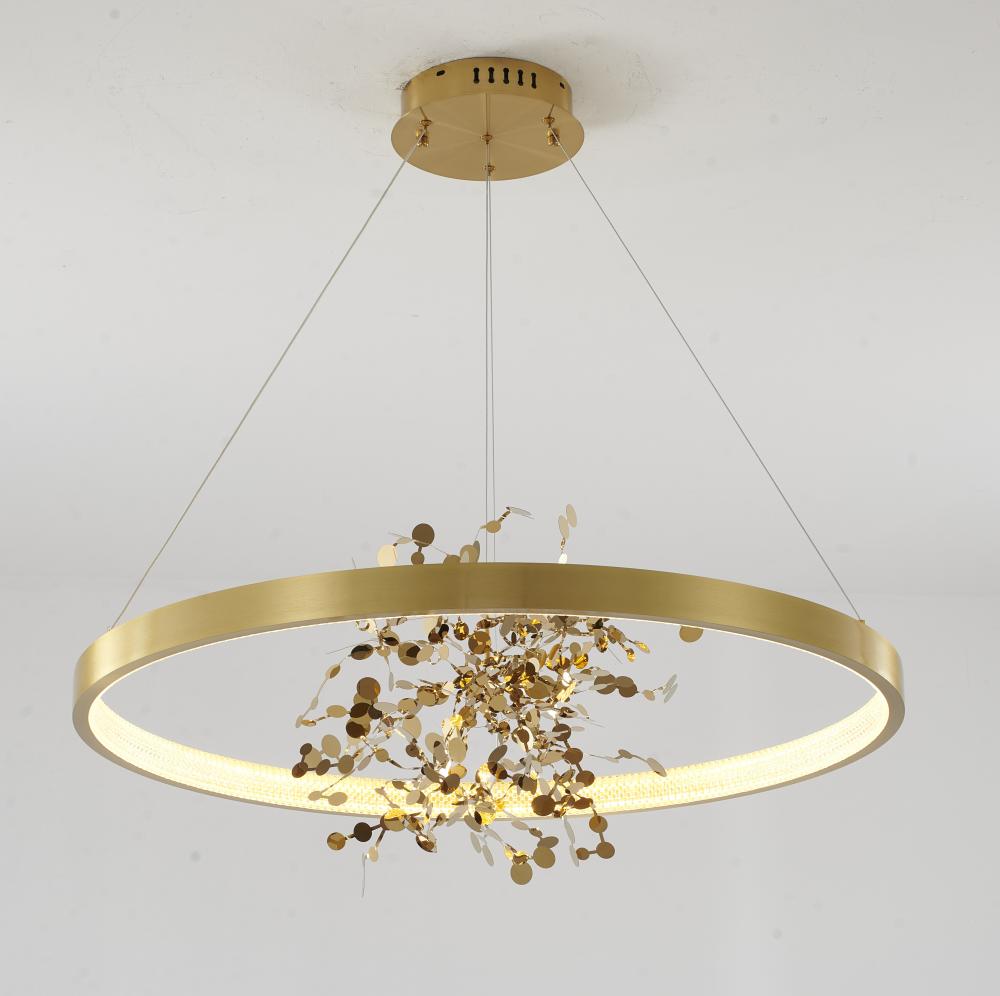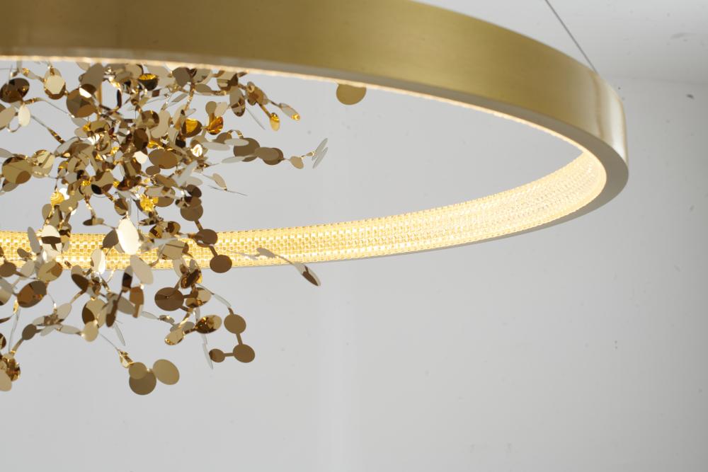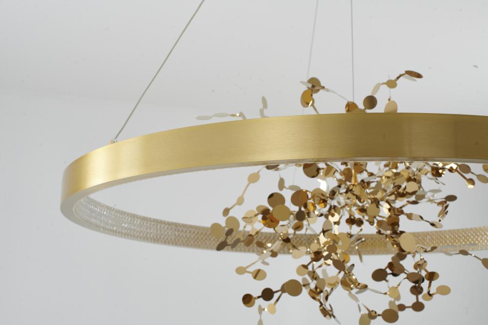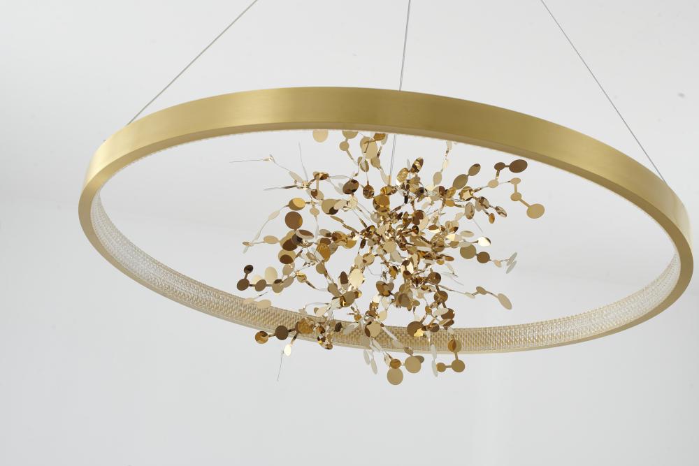 This chandelier is in a gold finish. It comes with a gold stainless steel confetti interior and a transparent diffuser. The cord length of 78 inches is provided and the cord length is adjustable.