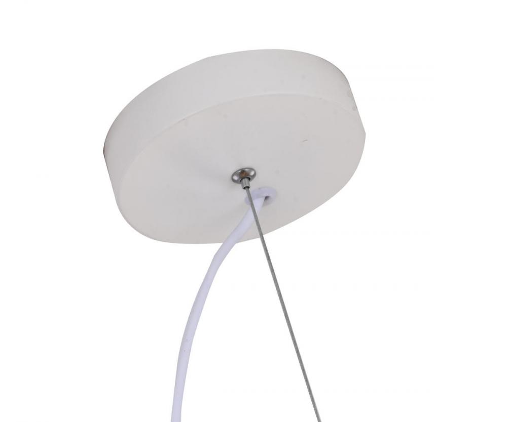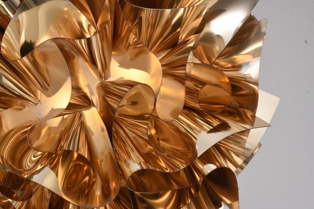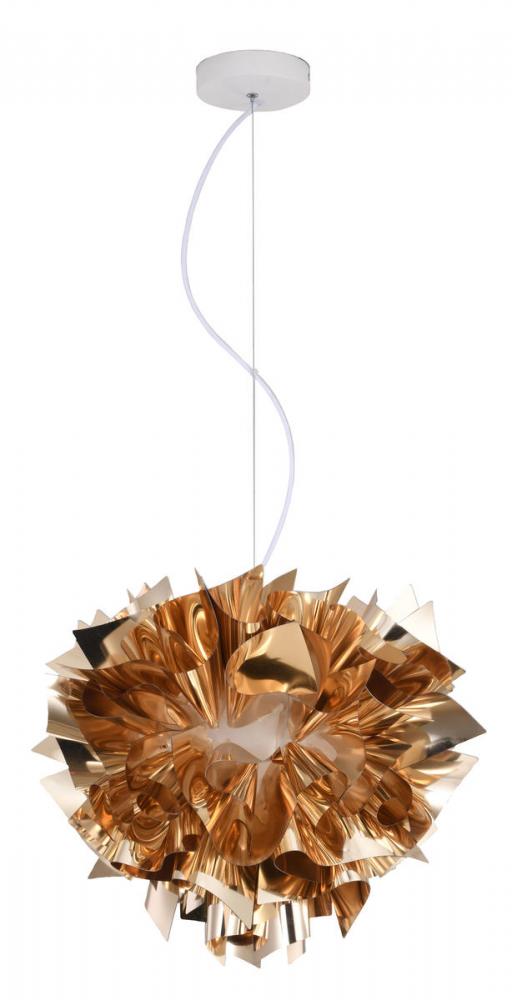 This unique chandelier is in a shiny gold finish. The frame is made out of iron, and it comes with a gold acrylic shade in a flower shape. The adjustable cord link makes this fixture suitable for most ceiling heights.