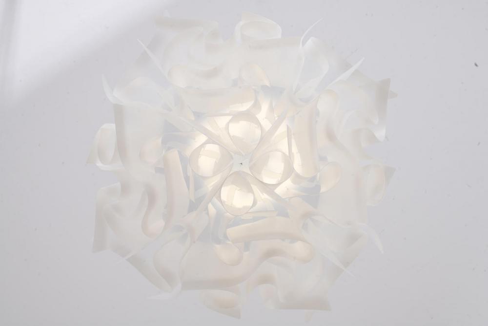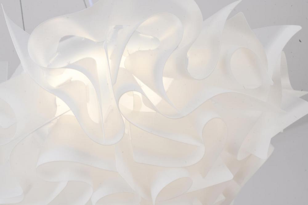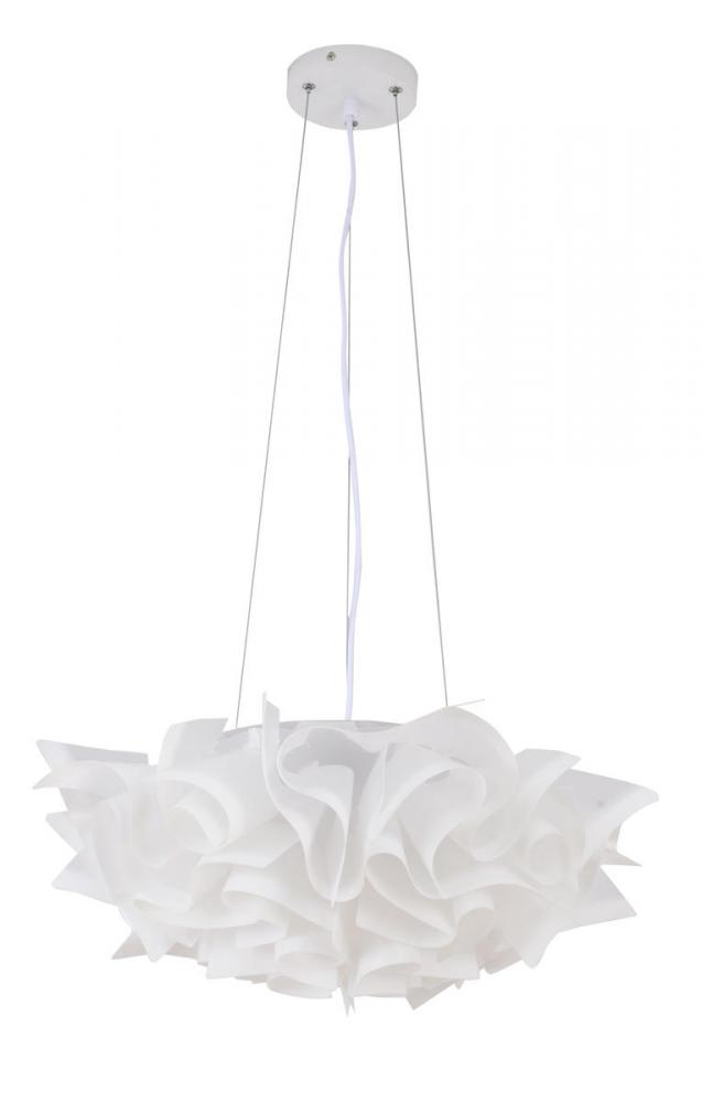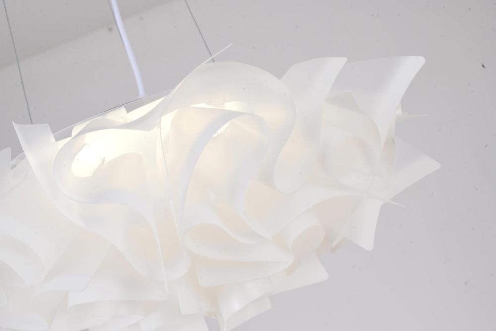 This unique chandelier is in a white finish. The frame is made out of iron, and it comes with a white acrylic shade in a flower shape. The adjustable cord link makes this fixture suitable for most ceiling heights.