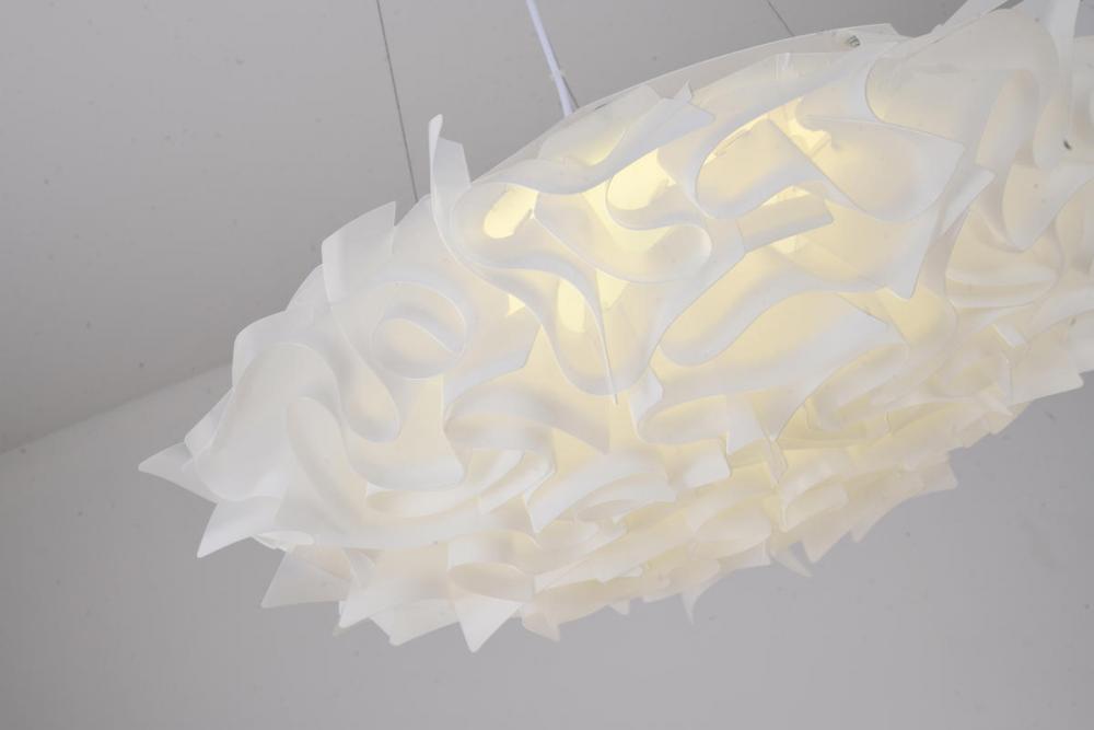 This unique chandelier is in a white finish. The frame is made out of iron, and it comes with a white acrylic shade in a flower shape. The adjustable cord link makes this fixture suitable for most ceiling heights.