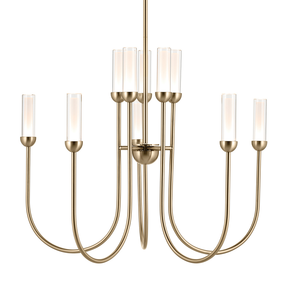 On-trend yet timeless, the Moraine LED chandelier is true elegance. Swooping concentric curves update the traditional chandelier look. Each candle holder cups the integrated LED light source with layered glass. Clear outer glass pairs with an etched interior to give the illusion of ambient candles that light up any space.