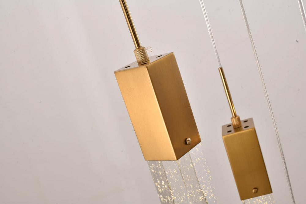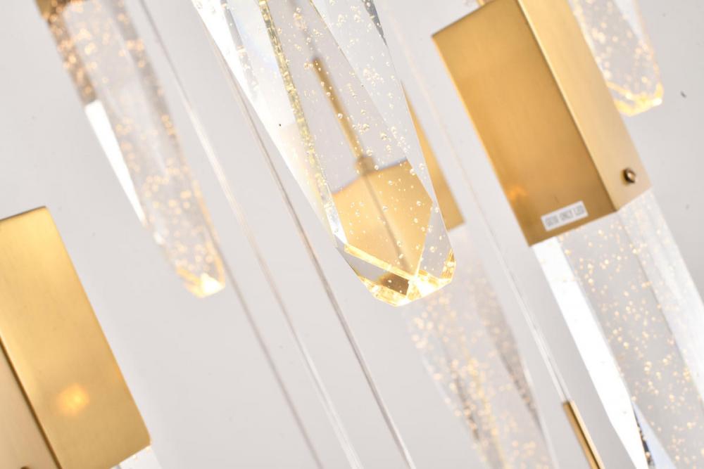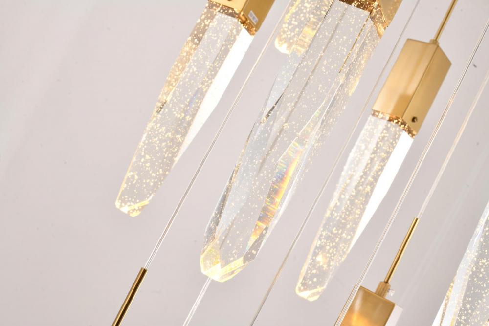 This exquisite chandelier is in a gold finish. The frame is made out of metal, and it comes with hanging clear iceberg bubble crystals. You can create a timeless feel while using modern forms.
