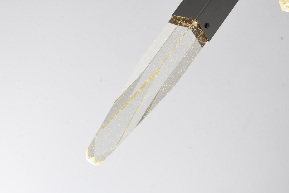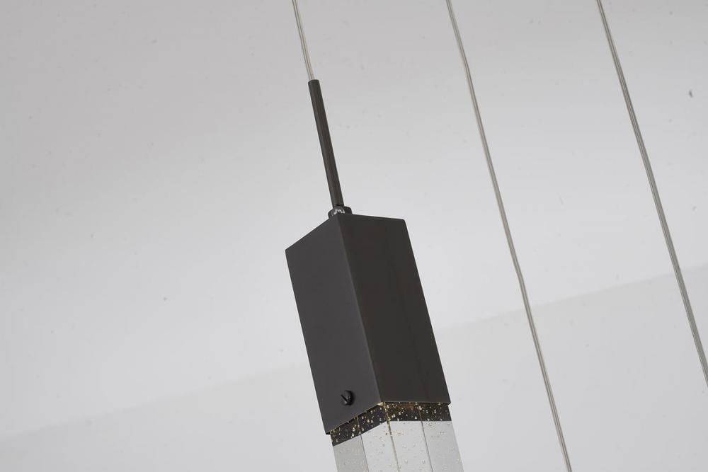 This exquisite chandelier is in a black finish. The frame is made out of metal, and it comes with hanging bubble iceberg crystals. The adjustable cord links make this fixture suitable for most ceiling heights.