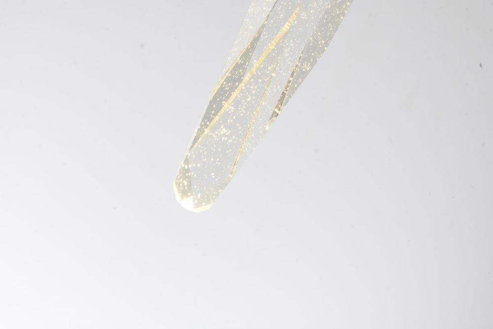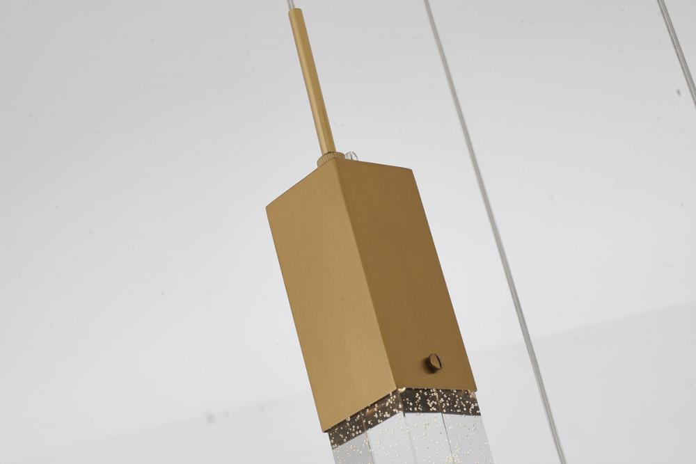 This exquisite chandelier is in a gold finish. The frame is made out of metal, and it comes with hanging bubble iceberg crystals. The adjustable cord links make this fixture suitable for most ceiling heights.