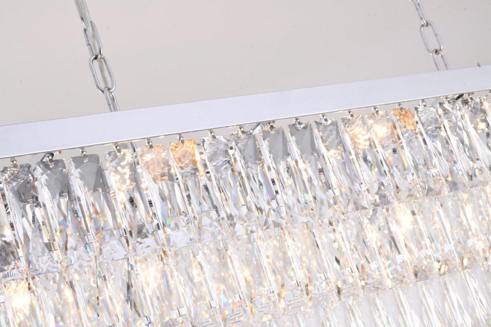 This exquisite chandelier is in a chrome finish. The frame is made out of metal, and it comes with clear hanging crystals. The adjustable chain links make this fixture suitable for most ceiling heights.
