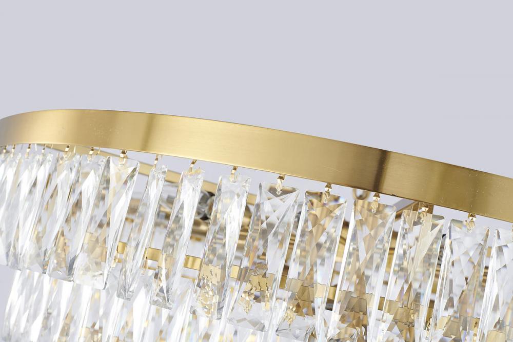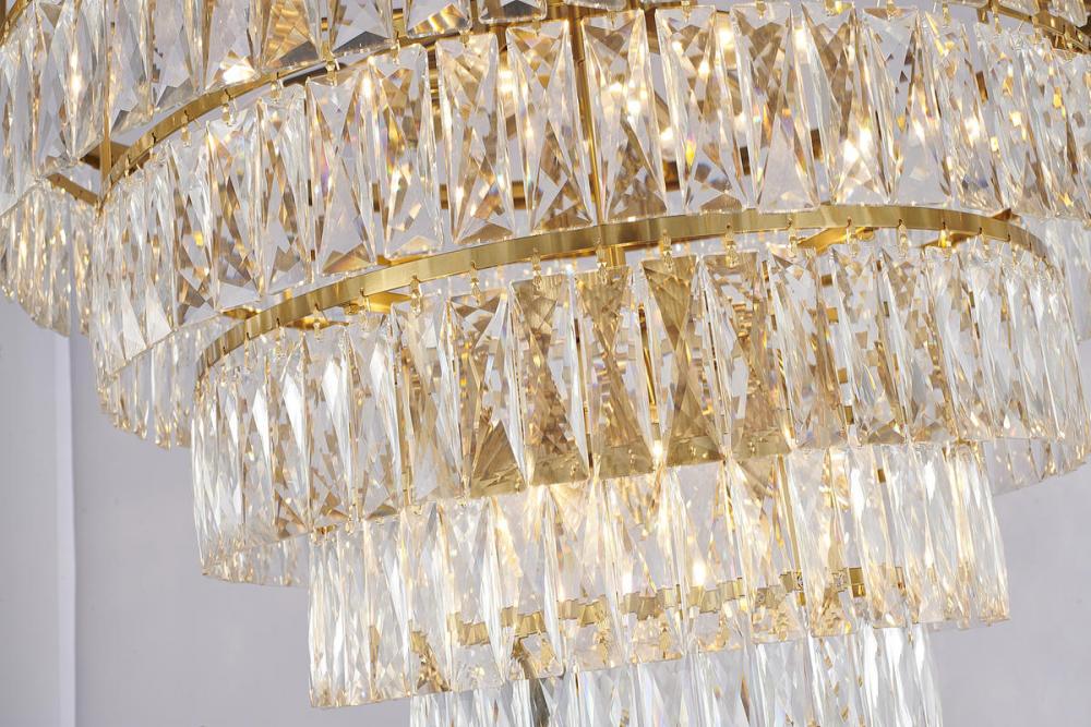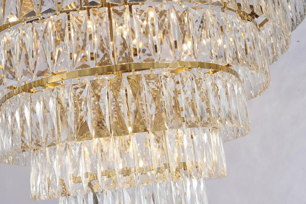 This eight-tier exquisite chandelier is in a gold finish. The frame is made out of metal, and it comes with clear hanging crystals. The chain link can be adjustable, and you can create a timeless feel while using modern forms