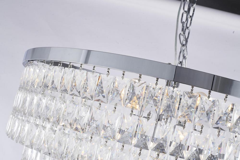 This nine-tier exquisite chandelier is in a chrome finish. The frame is made out of metal, and it comes with clear hanging crystals. The chain link can be adjustable, and you can create a timeless feel while using modern forms