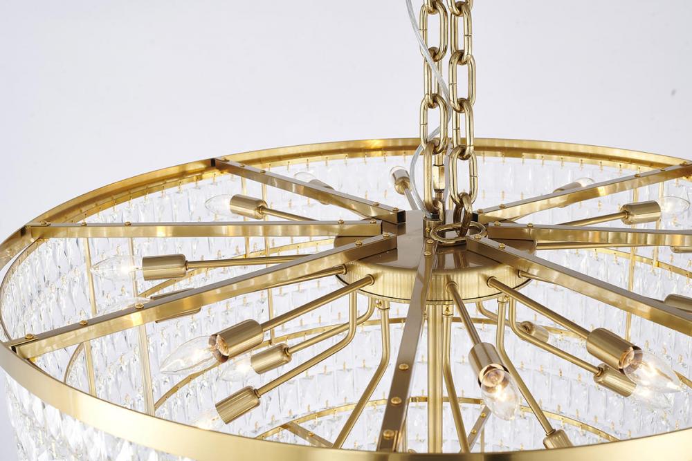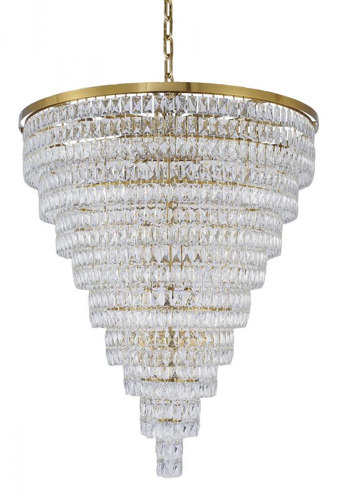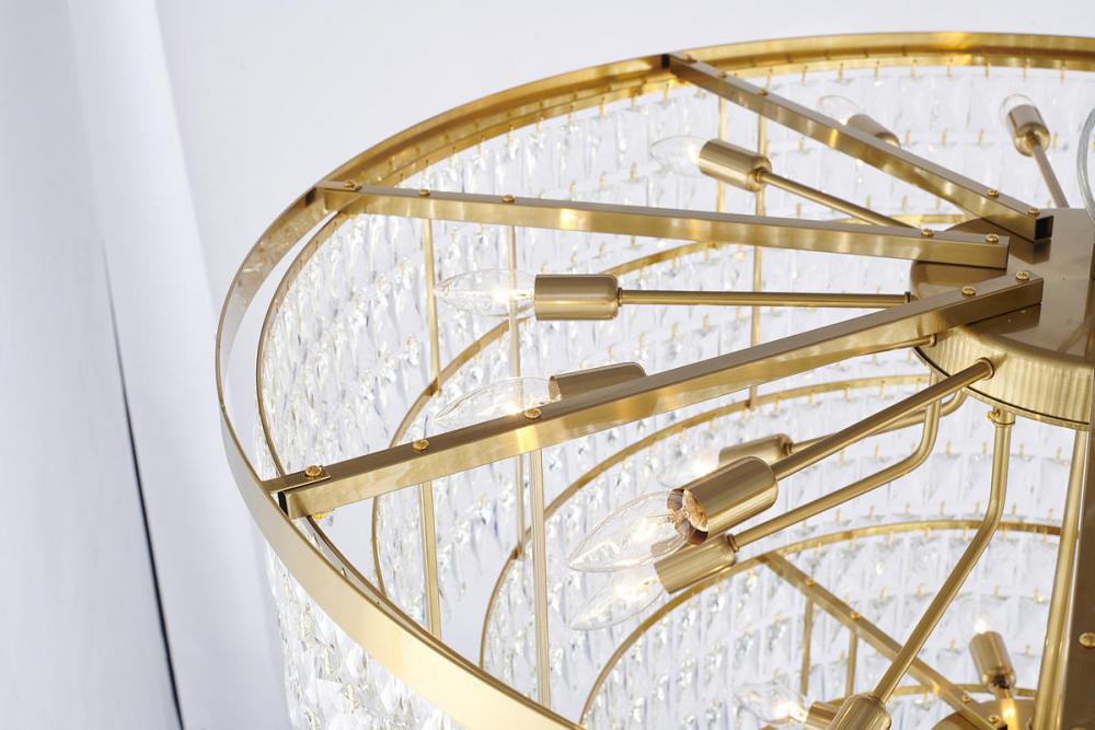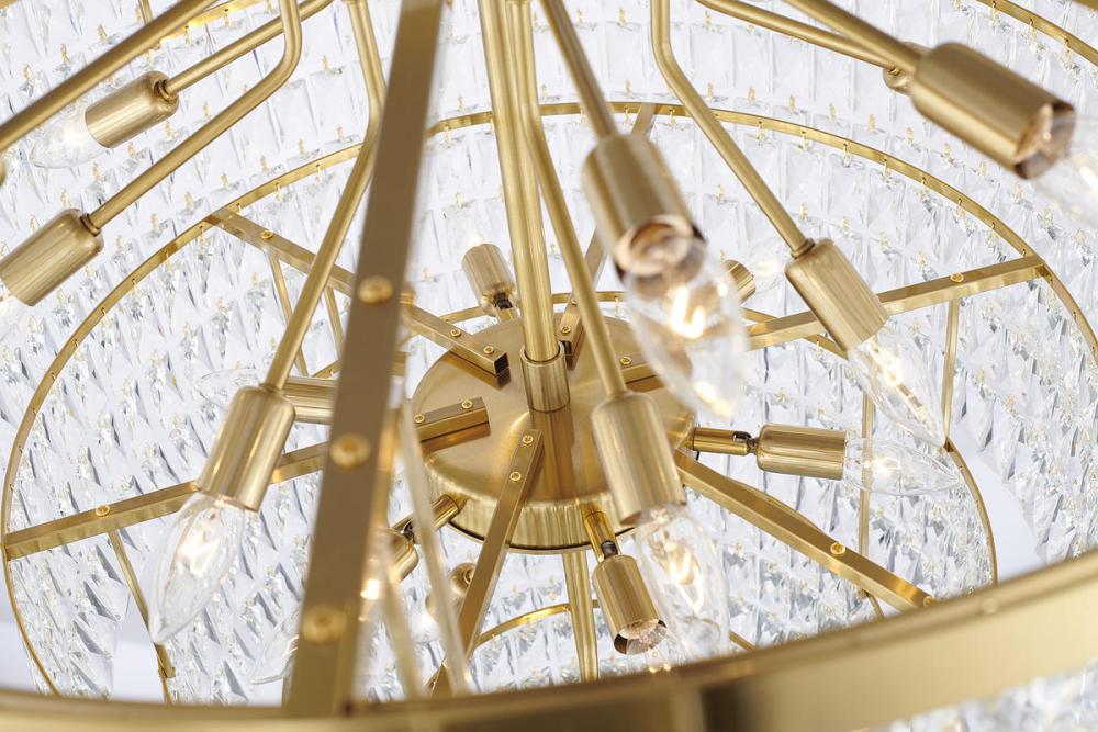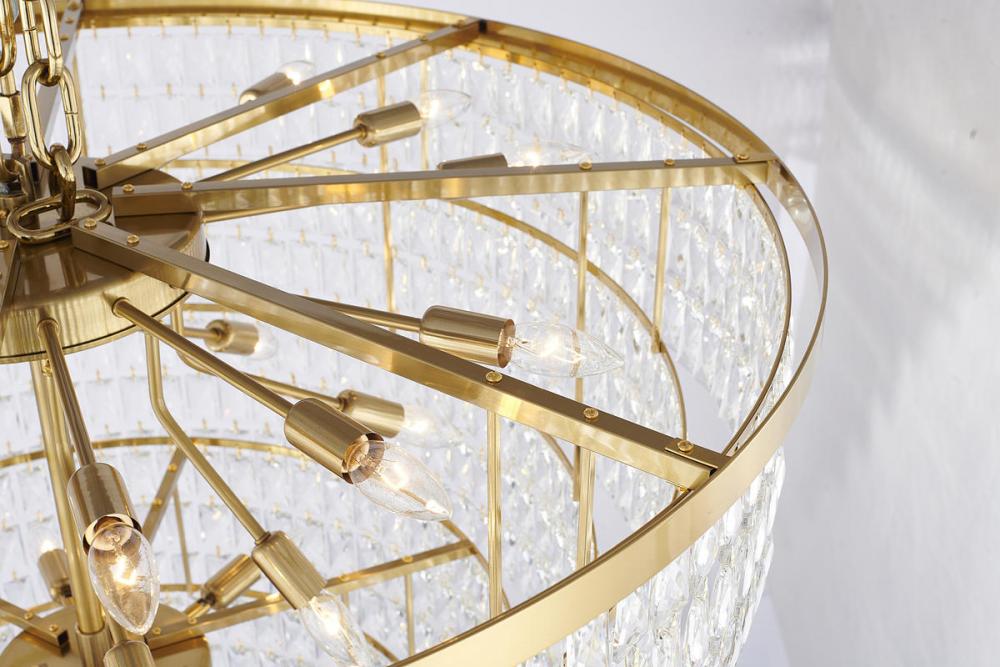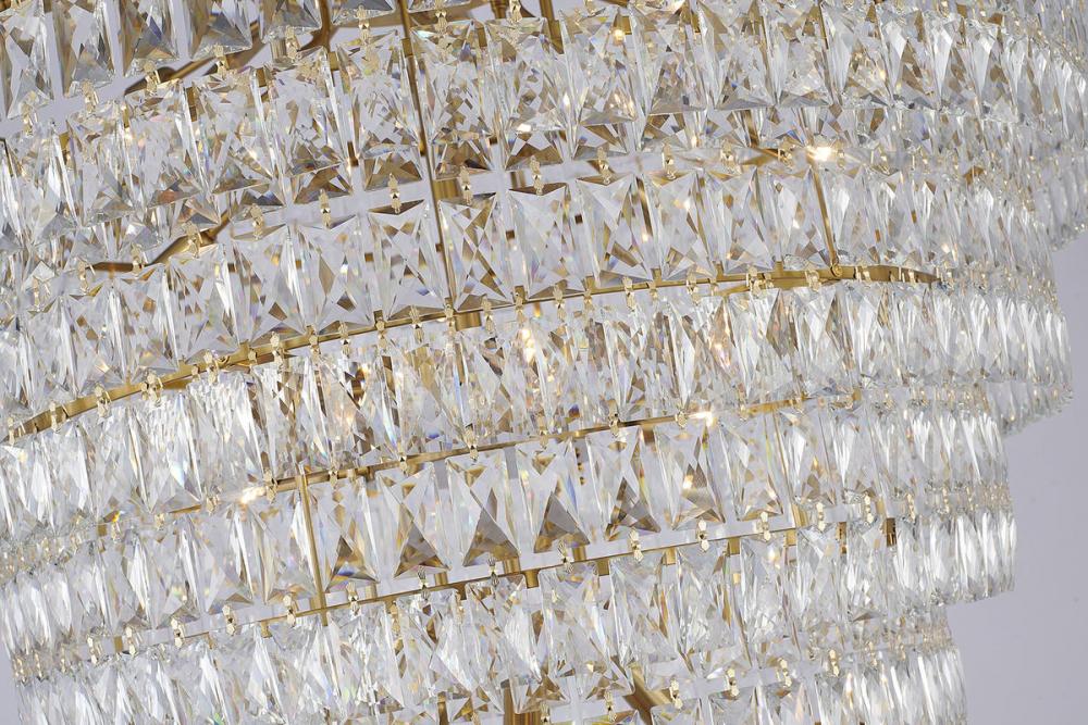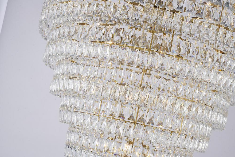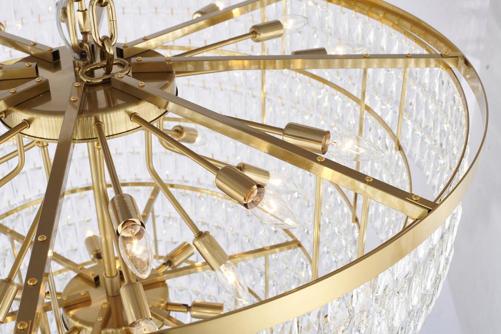 This nine-tier exquisite chandelier is in a gold finish. The frame is made out of metal, and it comes with clear hanging crystals. The chain link can be adjustable, and you can create a timeless feel while using modern forms