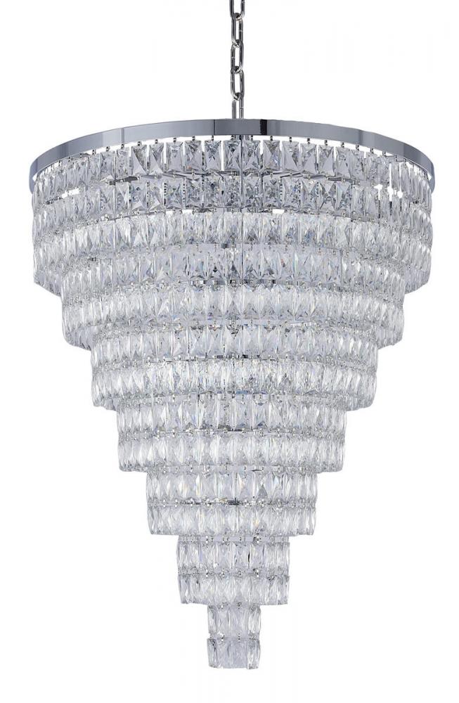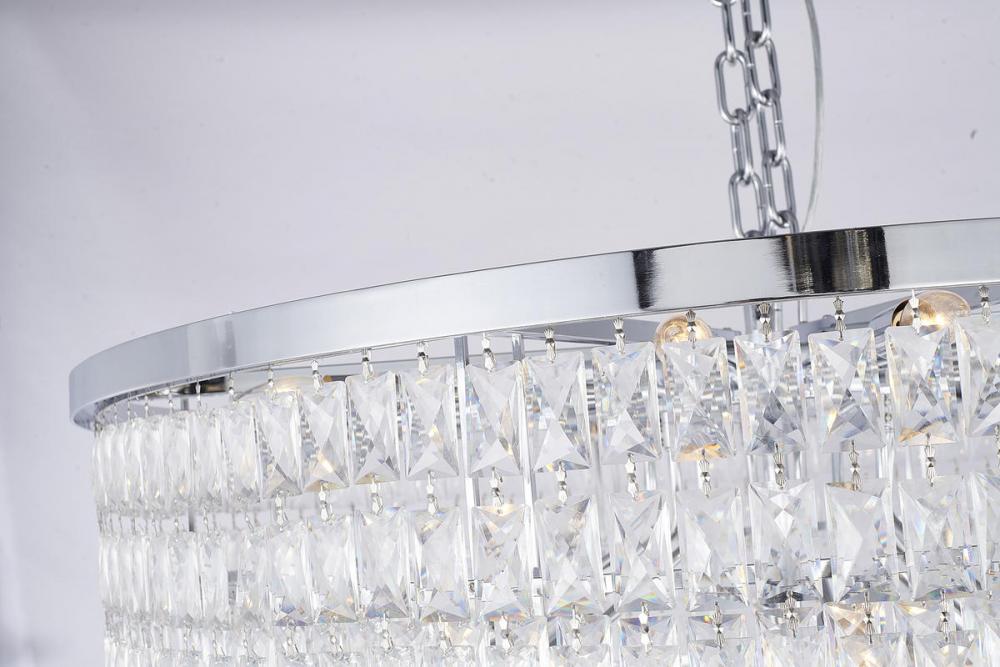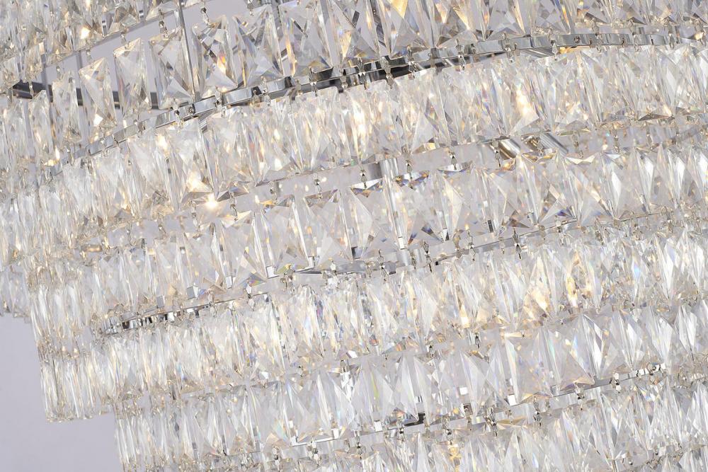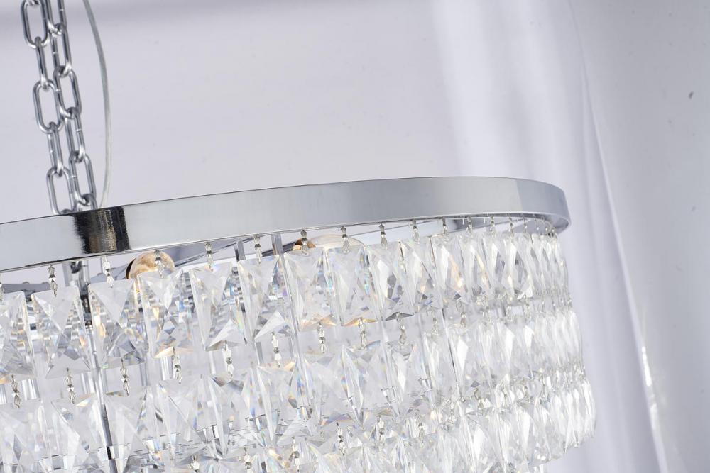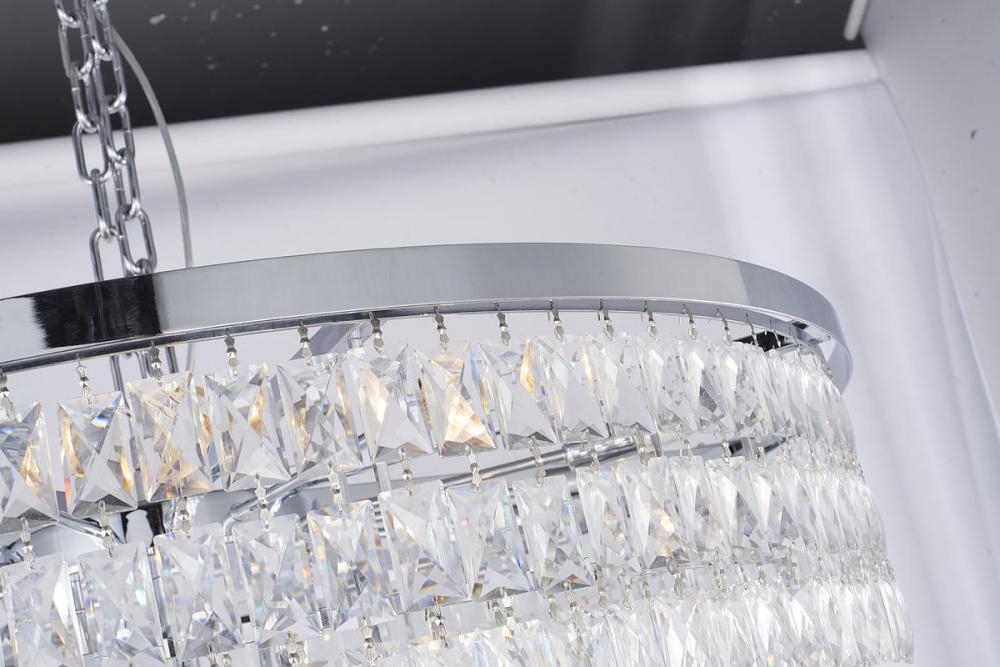 This seven-tier exquisite chandelier is in a chrome finish. The frame is made out of metal, and it comes with clear hanging crystals. The chain link can be adjustable, and you can create a timeless feel while using modern forms