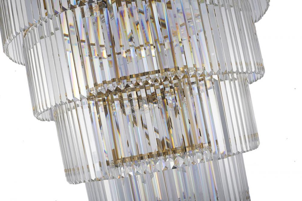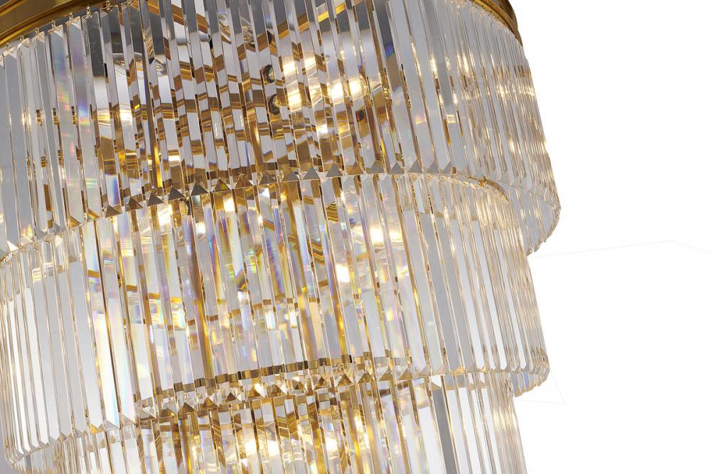 This seven-tier exquisite chandelier is in a brass finish. The frame is made out of metal, and it comes with clear hanging crystals. The chain link can be adjustable, and you can create a timeless feel while using modern forms