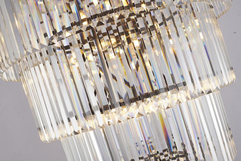 This exquisite 7-tier chandelier is in a black finish. The frame is made out of metal, and it comes with clear hanging crystals. It has a 144" chain link makes this fixture suitable for most ceiling heights.