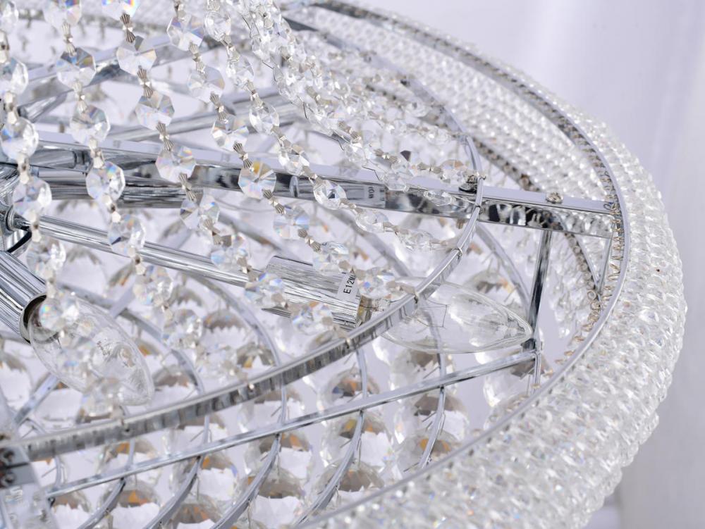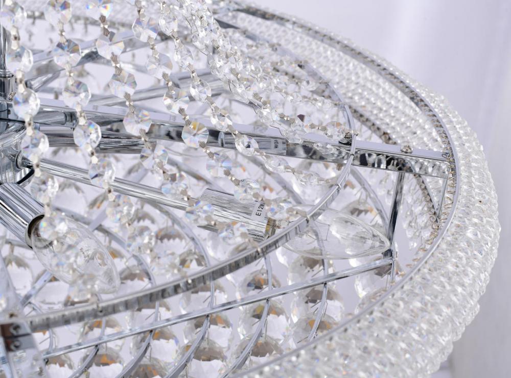 This exquisite chandelier is in a chrome finish. The frame is made out of metal, and it comes with clear crystal accents. The adjustable chain link makes this fixture suitable for most ceiling heights.