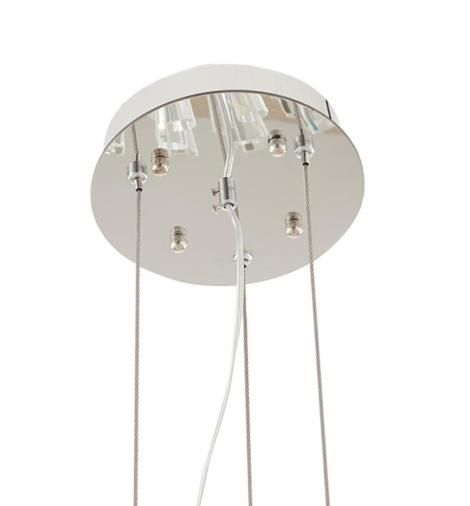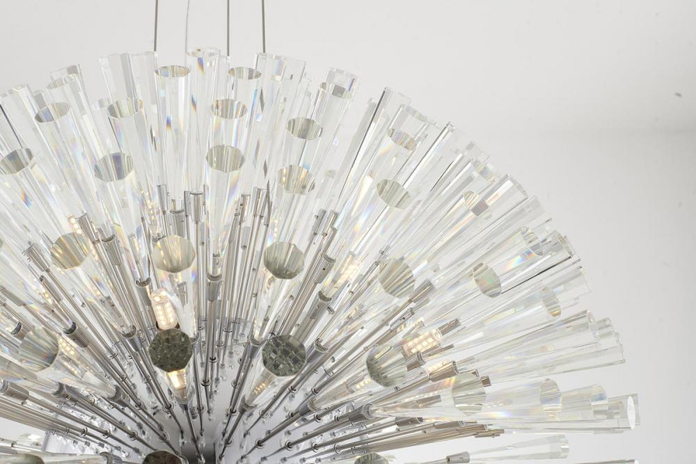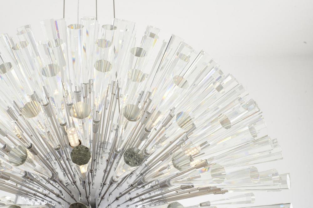 This exquisite chandelier is in a chrome finish. The frame is made out of metal, and it comes with clear crystal spikes. The adjustable cord links make this fixture suitable for most ceiling heights.