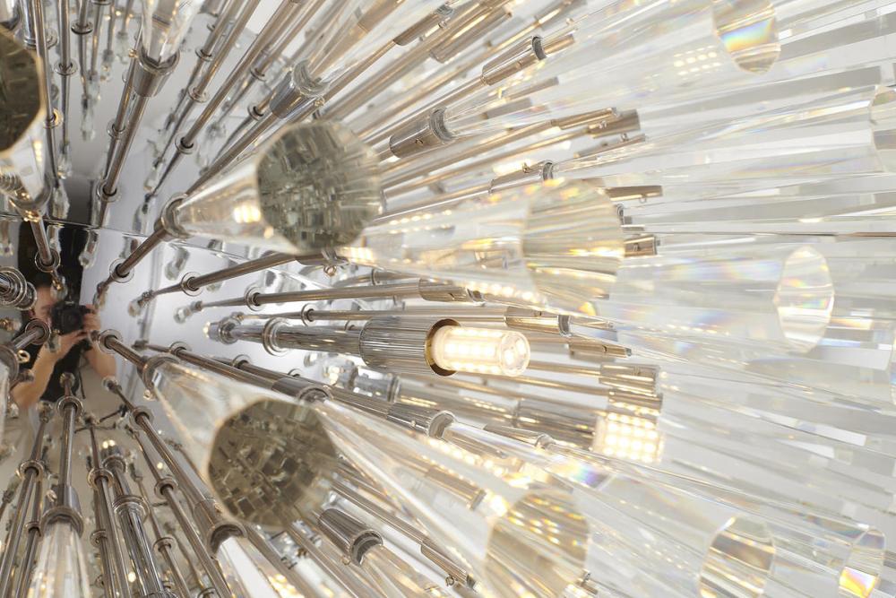 This chandelier has a chrome metal frame