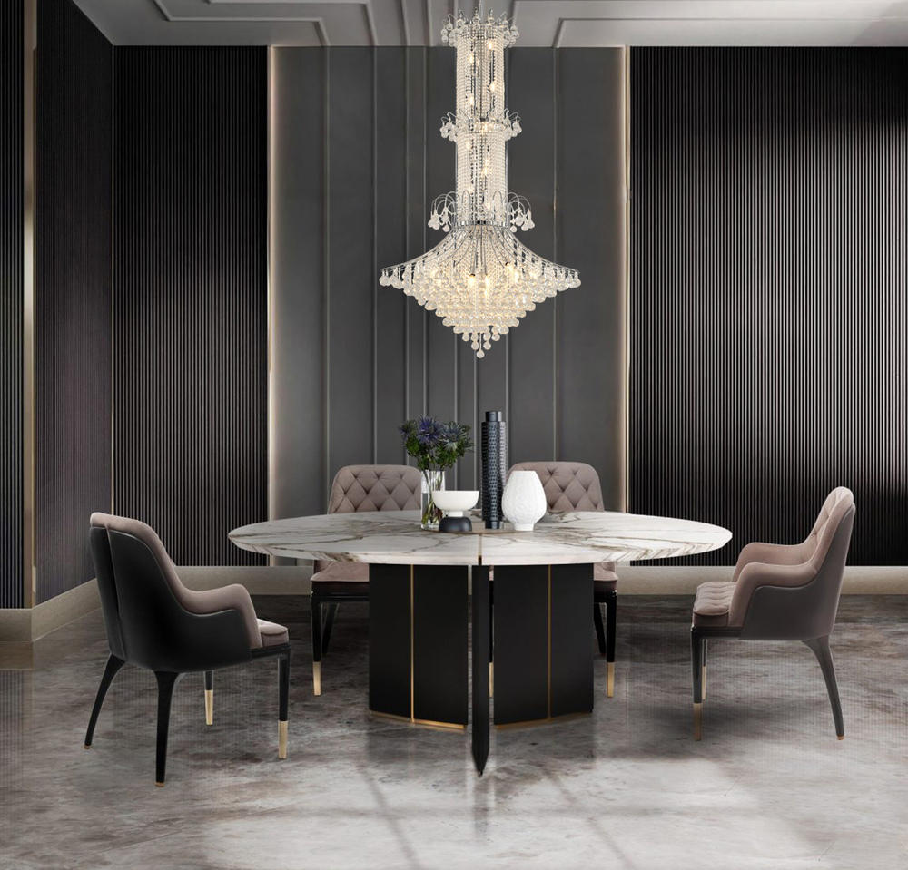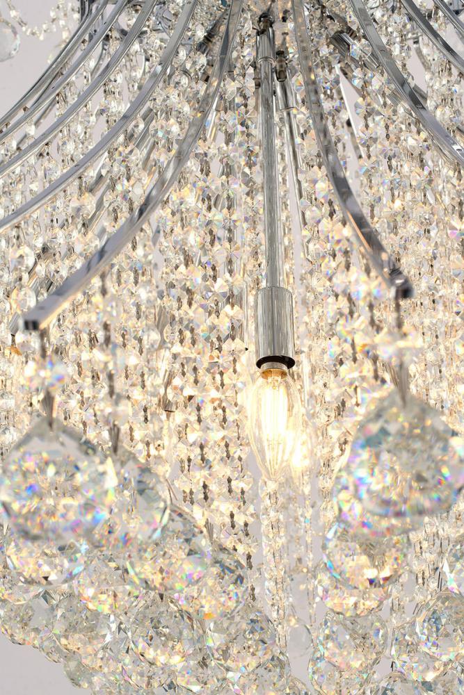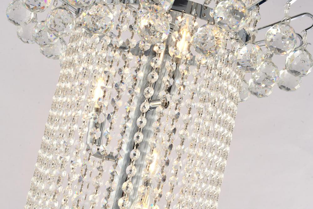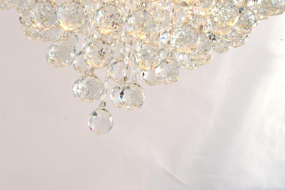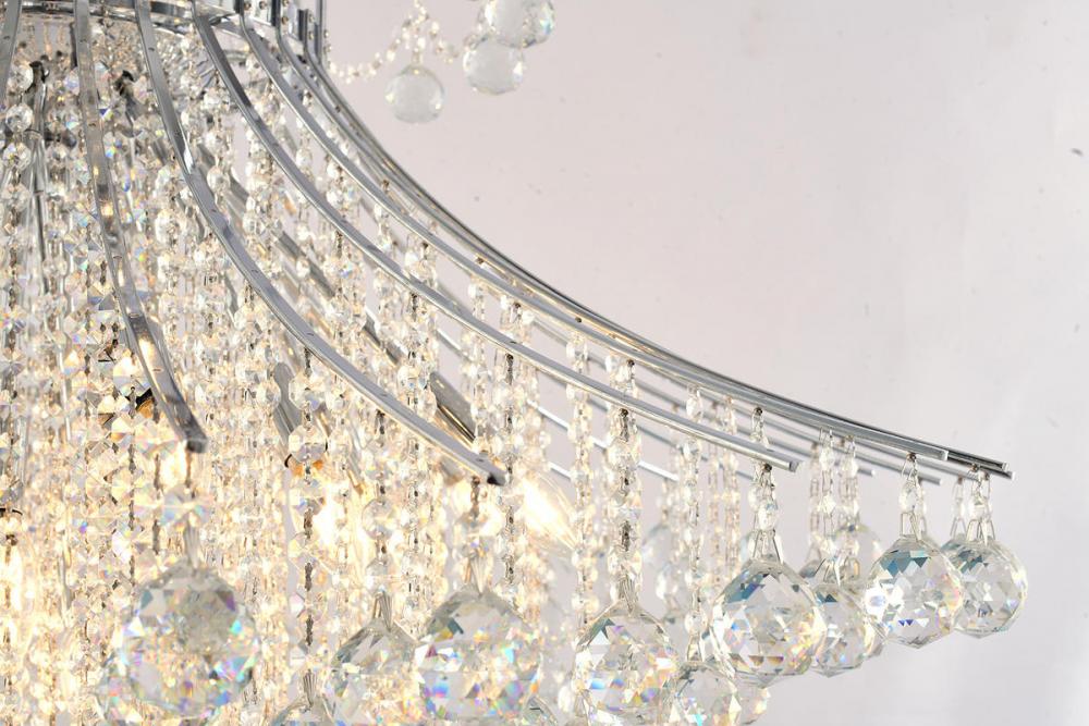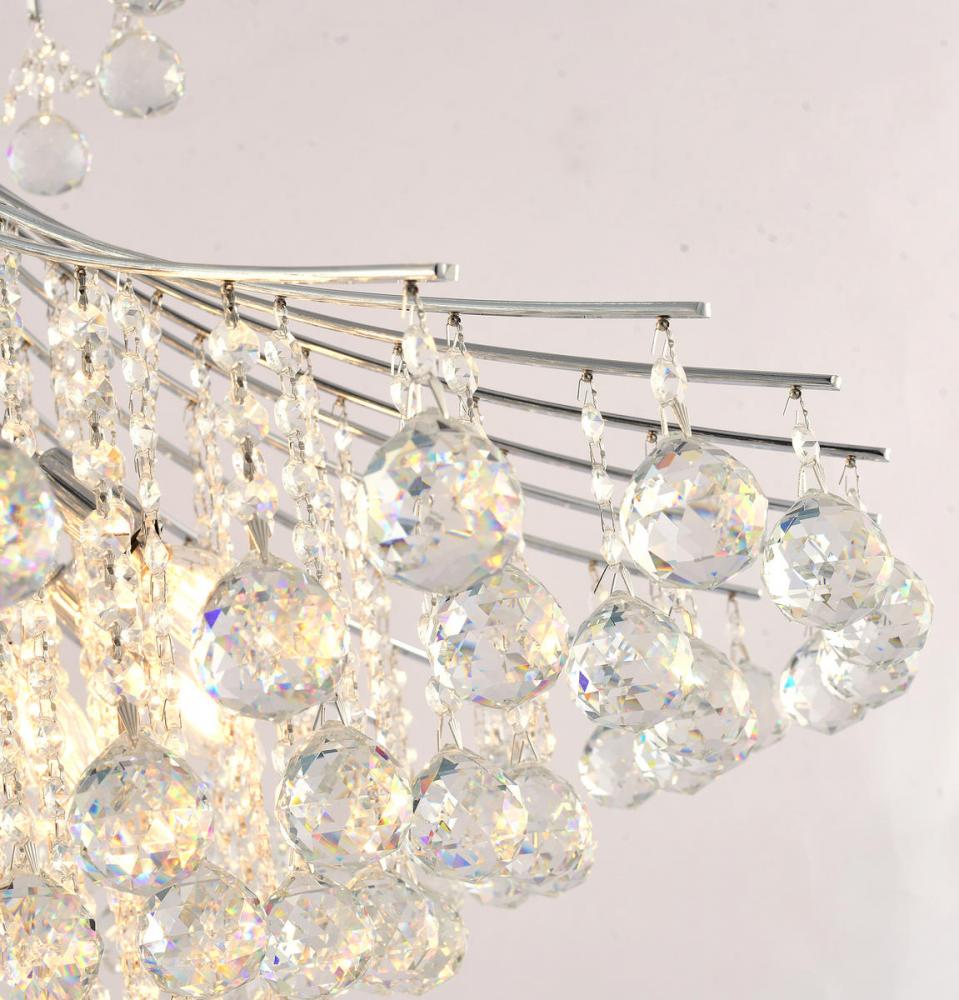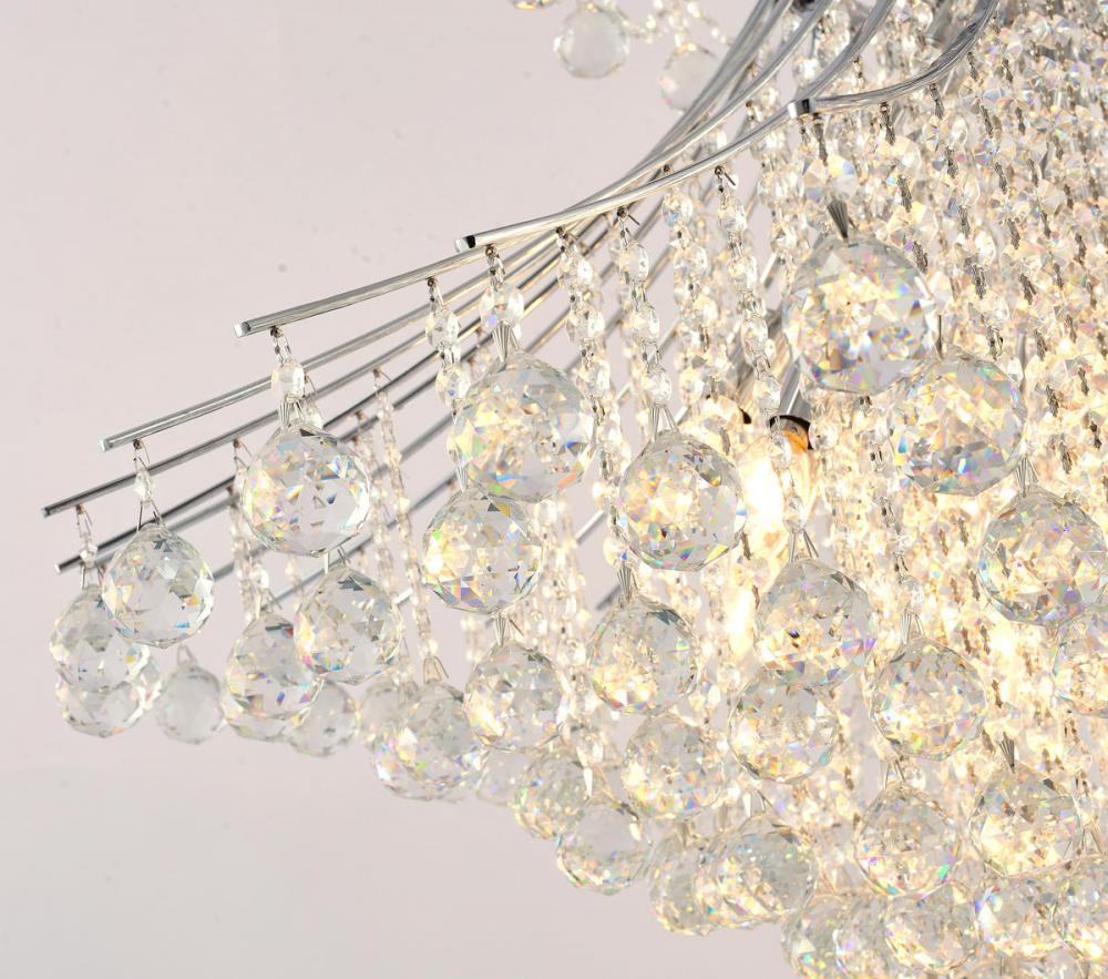 This exquisite chandelier is in a chrome finish. The frame is made out of metal, and it comes with clear hanging crystals. The adjustable chain link makes this fixture suitable for most ceiling heights.