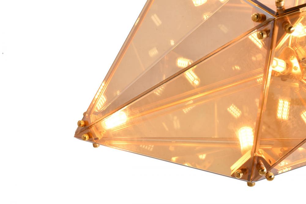 This unique chandelier is in a gold finish. The frame is made out of metal, and it has an amber glass shade. The adjustable rod link makes this fixture suitable for most ceiling heights.