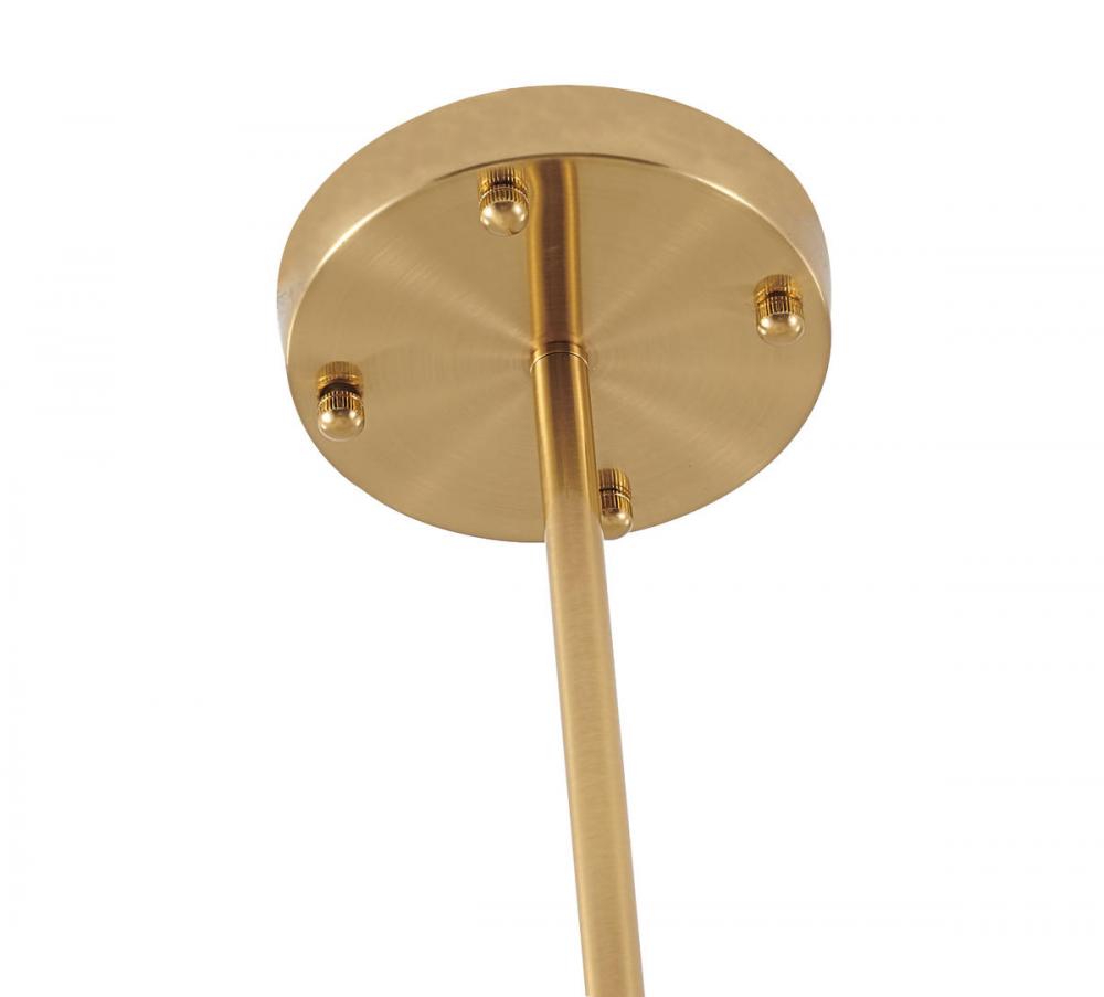This chandelier is in a gold finish. The frame is made out of metal, and it comes with white frosted glass hanging shades. The adjustable rod link makes this fixture suitable for most ceiling heights.