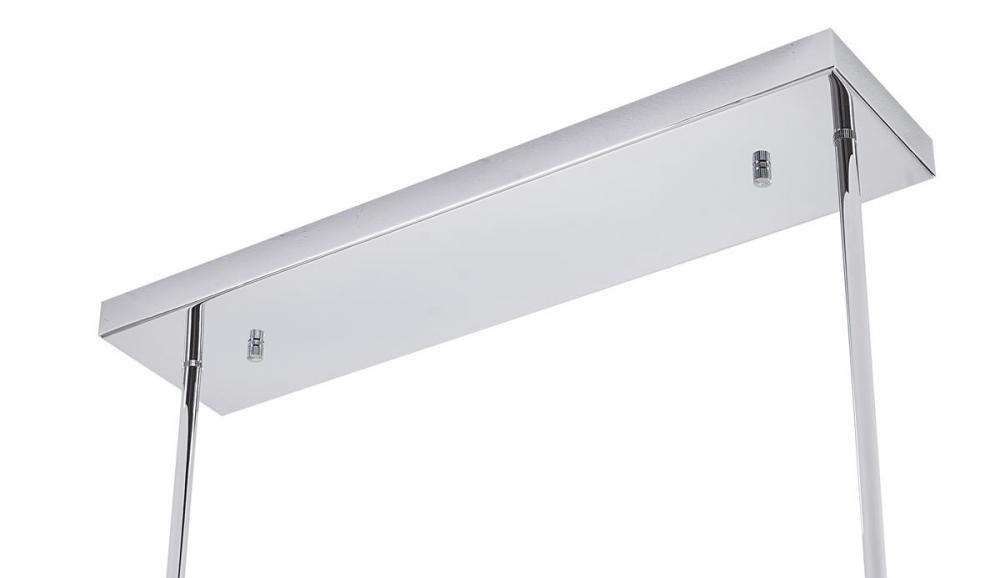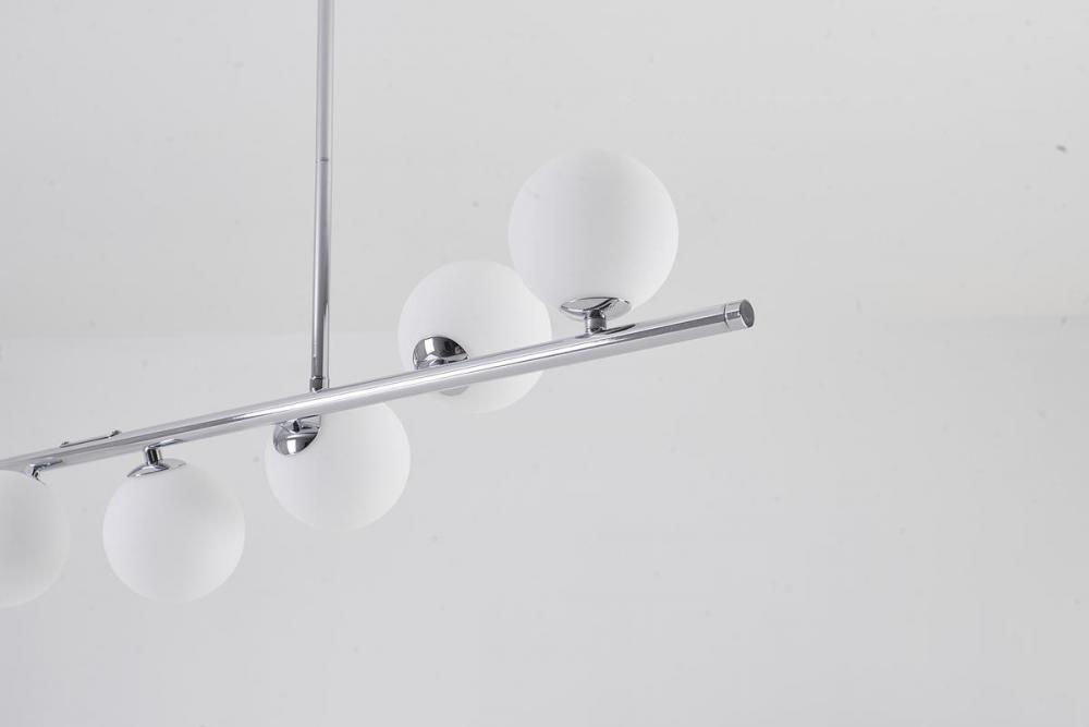 This exquisite chandelier is in a chrome finish. The frame is made out of metal, and it comes with white glass shades. The adjustable rod links make this fixture suitable for most ceiling heights