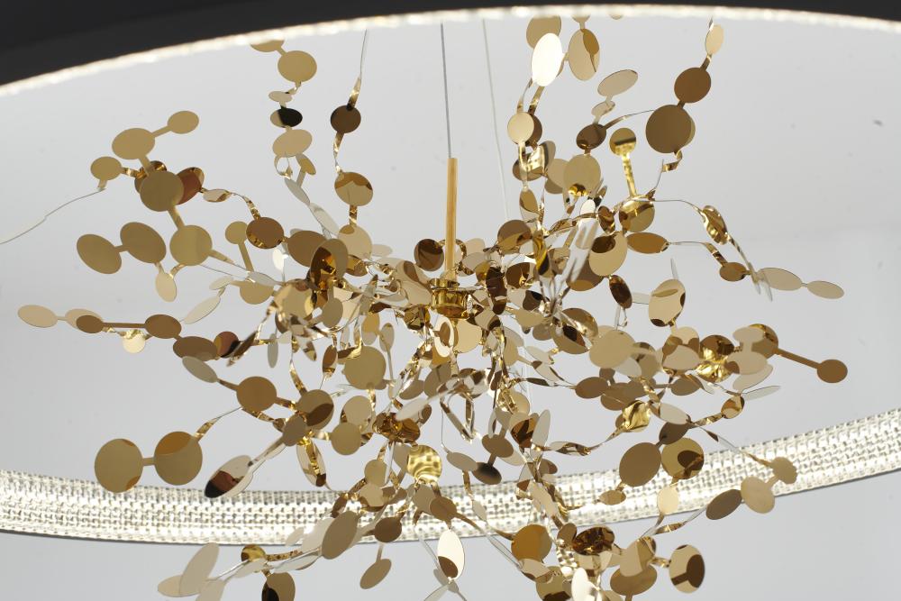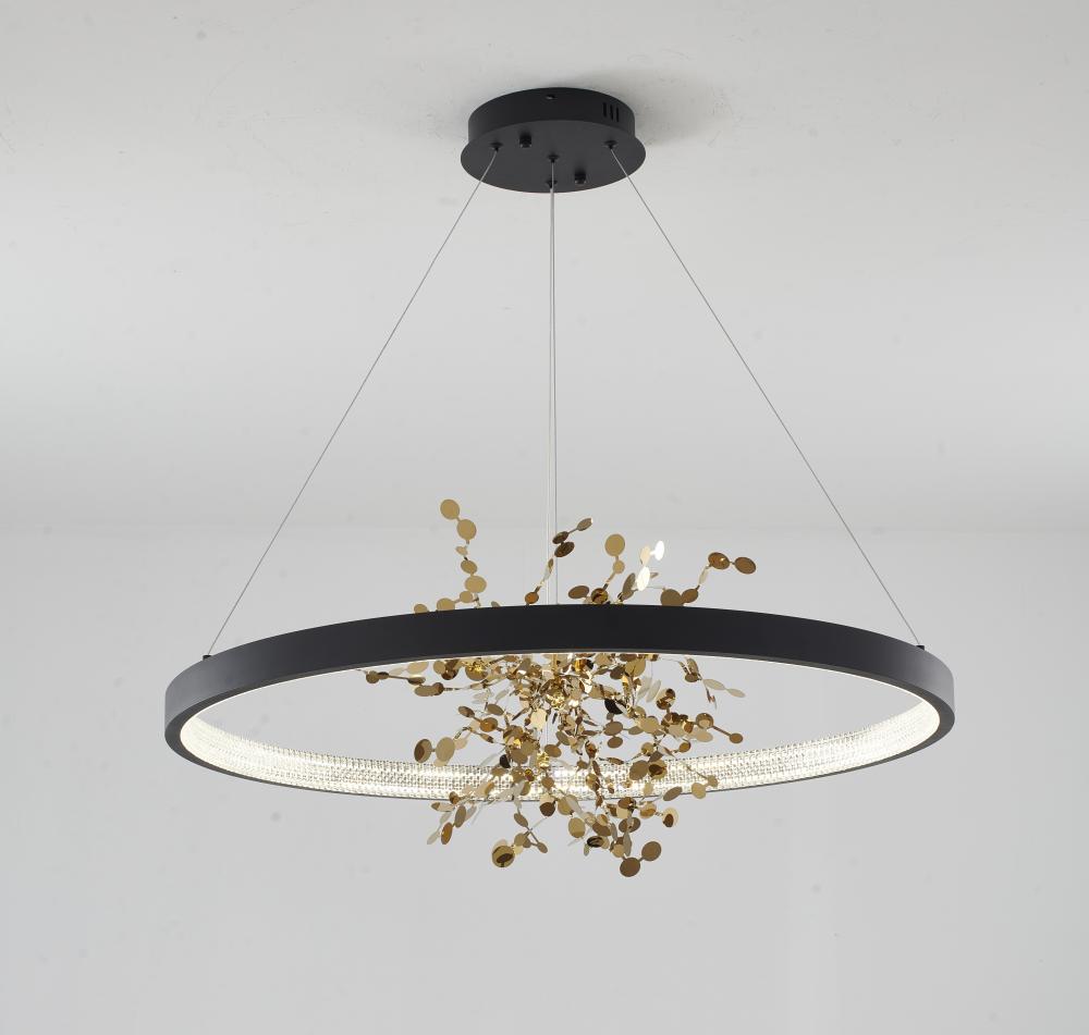 This chandelier is in a sand black finish. It comes with a gold stainless steel confetti interior and a transparent diffuser. The cord length of 78 inches is provided and the cord length is adjustable.