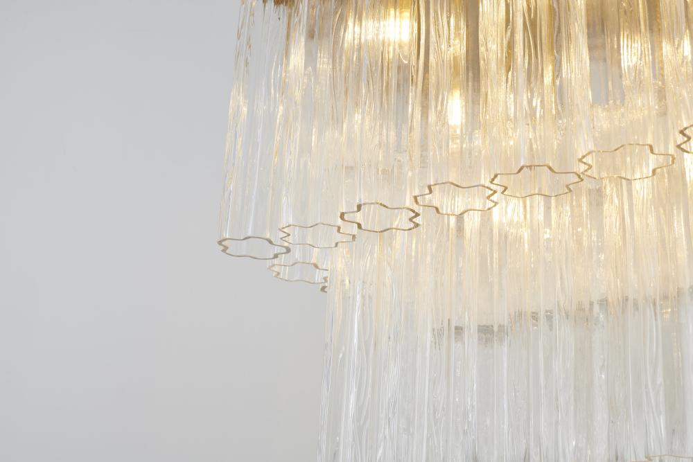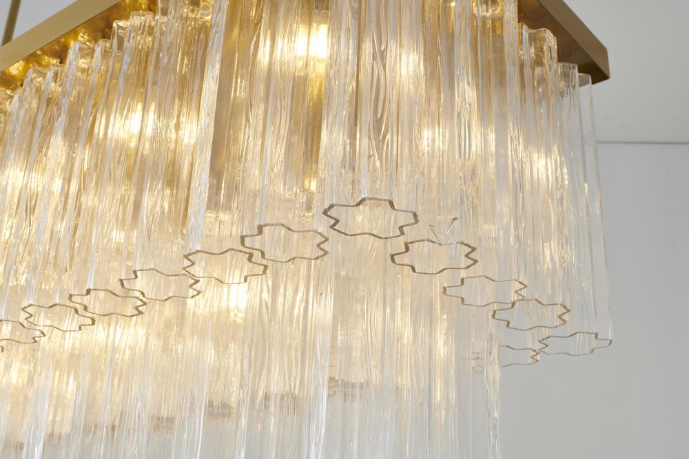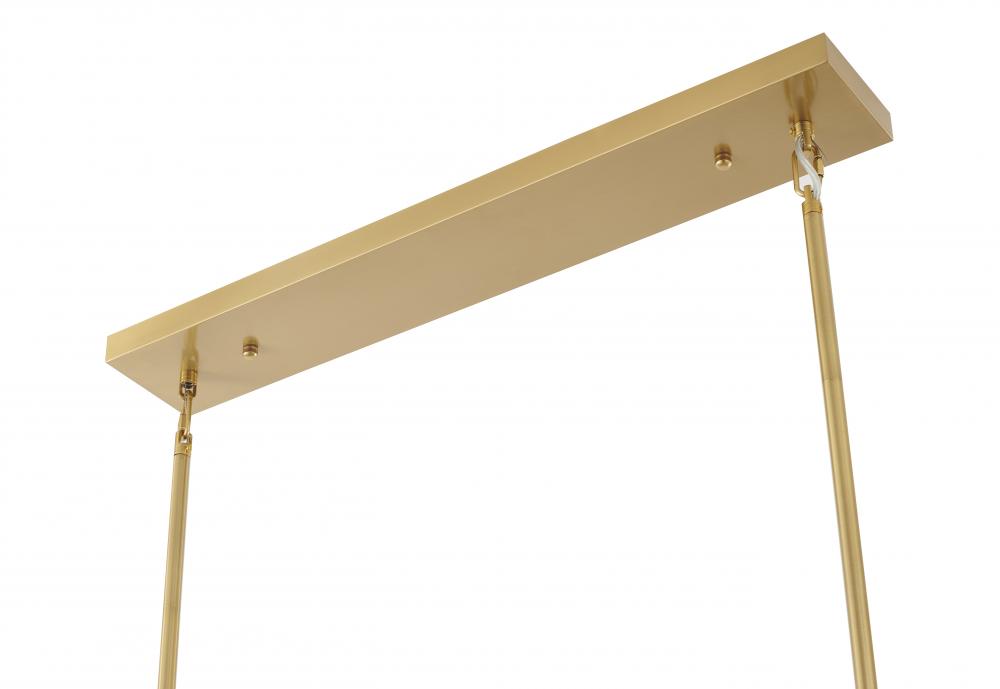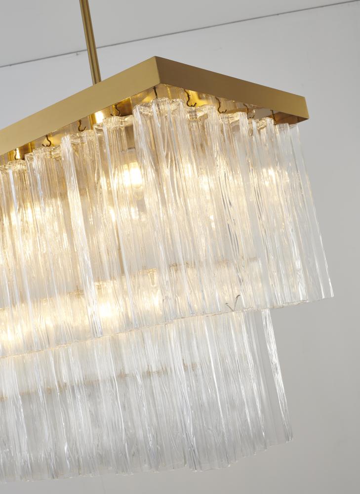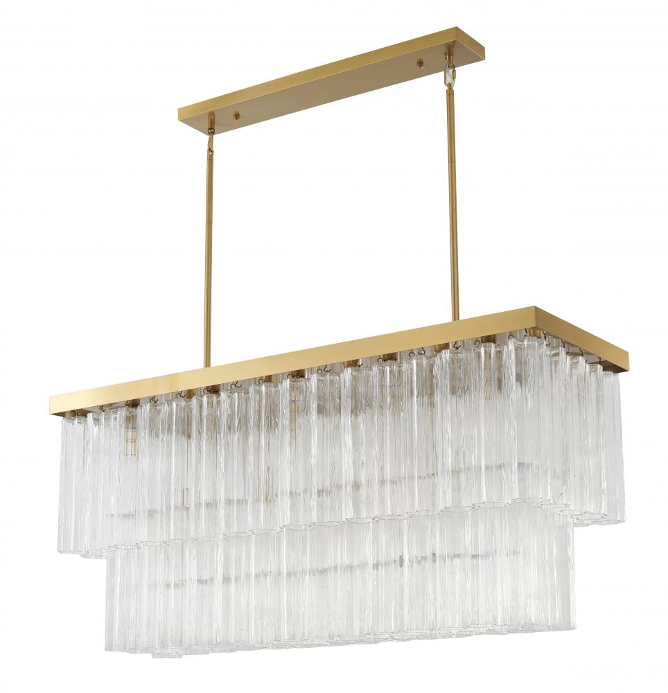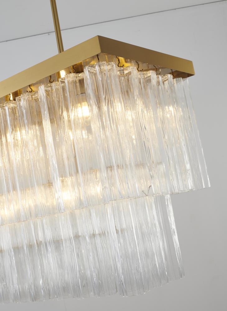 This chandelier is a satin brass rectangular frame chandelier. It comes with clear hanging ribbed glass. The rod length of 16" + 16" + 12" + 6" is provided and the rod length is adjustable.