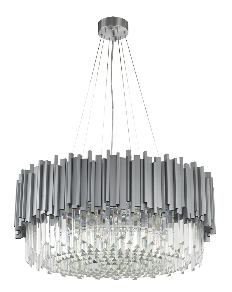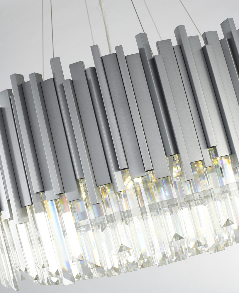 This exquisite chandelier is in a silver finish. The frame is made out of stainless steel, and it comes with clear hanging crystals. The adjustable cord links make this fixture suitable for most ceiling heights.