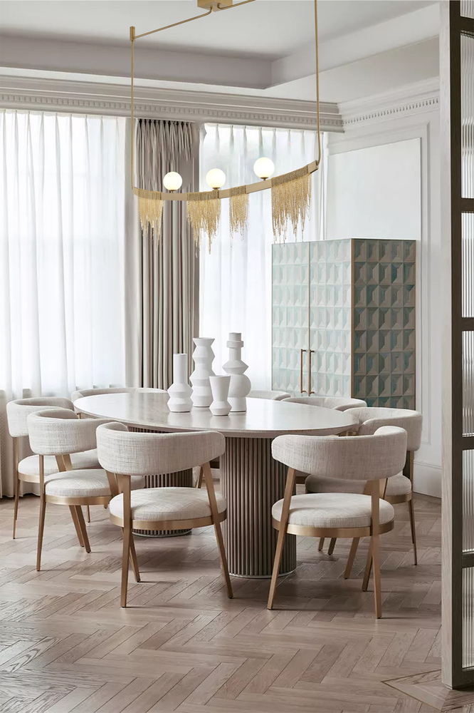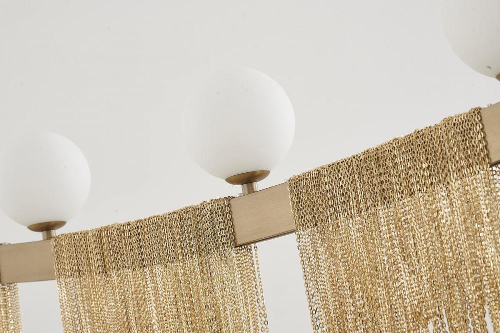 This exquisite chandelier is in a gold finish. The frame is made out of stainless steel, and it comes with hanging chain dropping and white glass shades. The adjustable rod links make this fixture suitable for most ceiling heights.