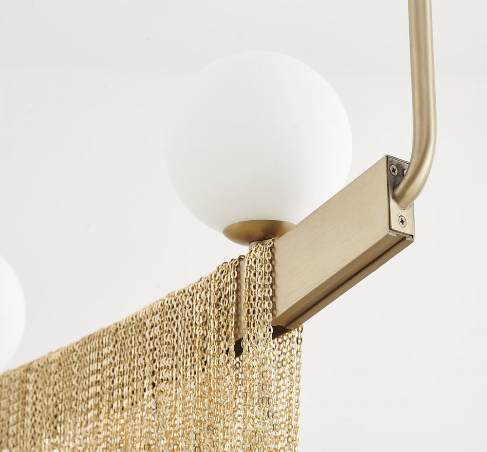 This exquisite chandelier is in a gold finish. The frame is made out of stainless steel, and it comes with hanging chain dropping and white glass shades. The adjustable rod links make this fixture suitable for most ceiling heights.