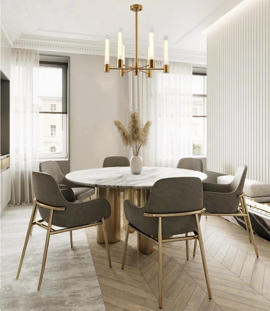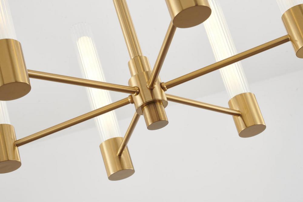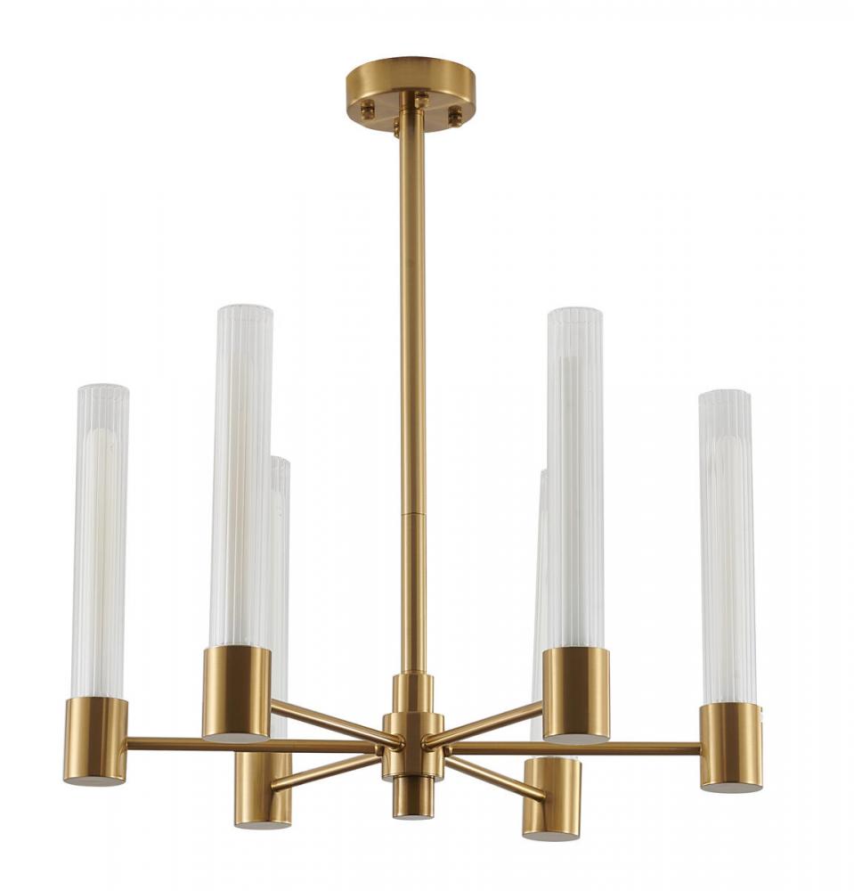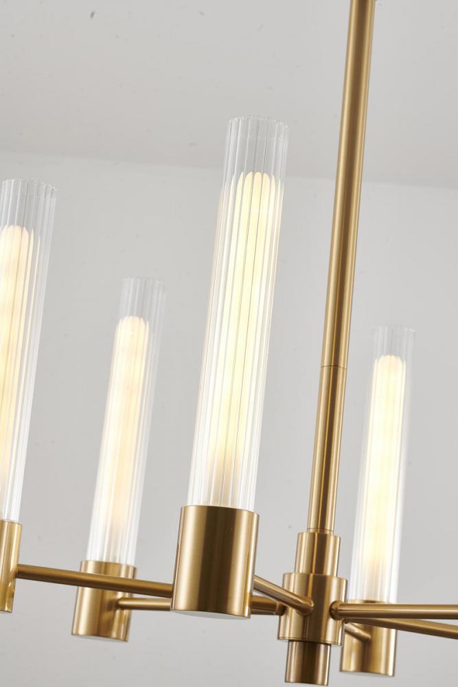 This exquisite chandelier is in a brass finish. The frame is made out of steel, and it comes with clear glass shades. The adjustable rod link makes this fixture suitable for most ceiling heights.