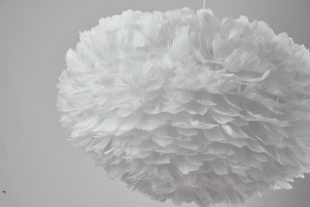 This unique ceiling fixture is in a white finish. The frame is made out of iron in white color, and it is surrounded by goose feather in white color. The adjustable cord link makes this fixture suitable for most ceiling heights.