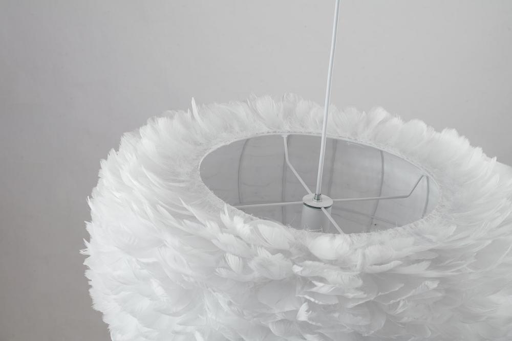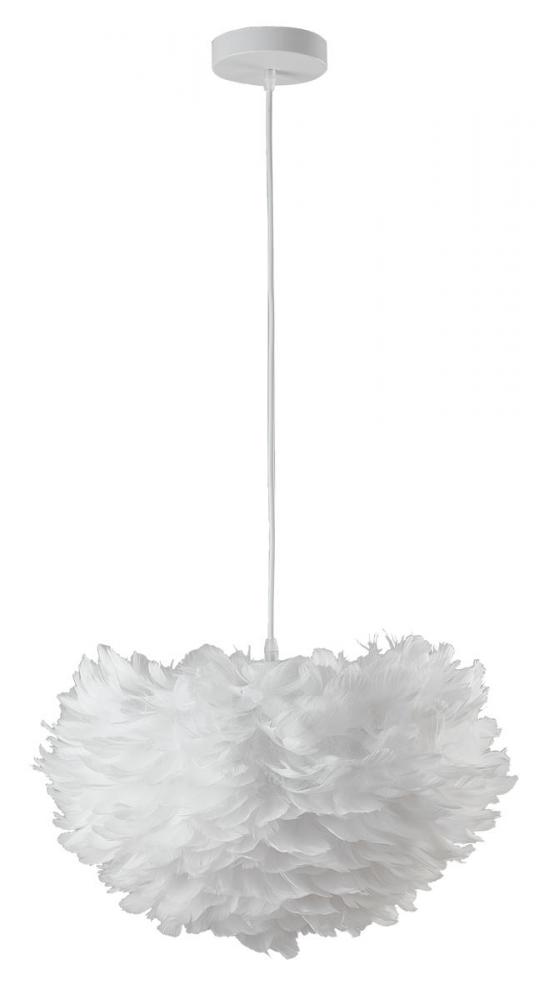 This unique ceiling fixture is in a white finish. The frame is made out of iron in white color, and it is surrounded by goose feather in white color. The adjustable cord link makes this fixture suitable for most ceiling heights.