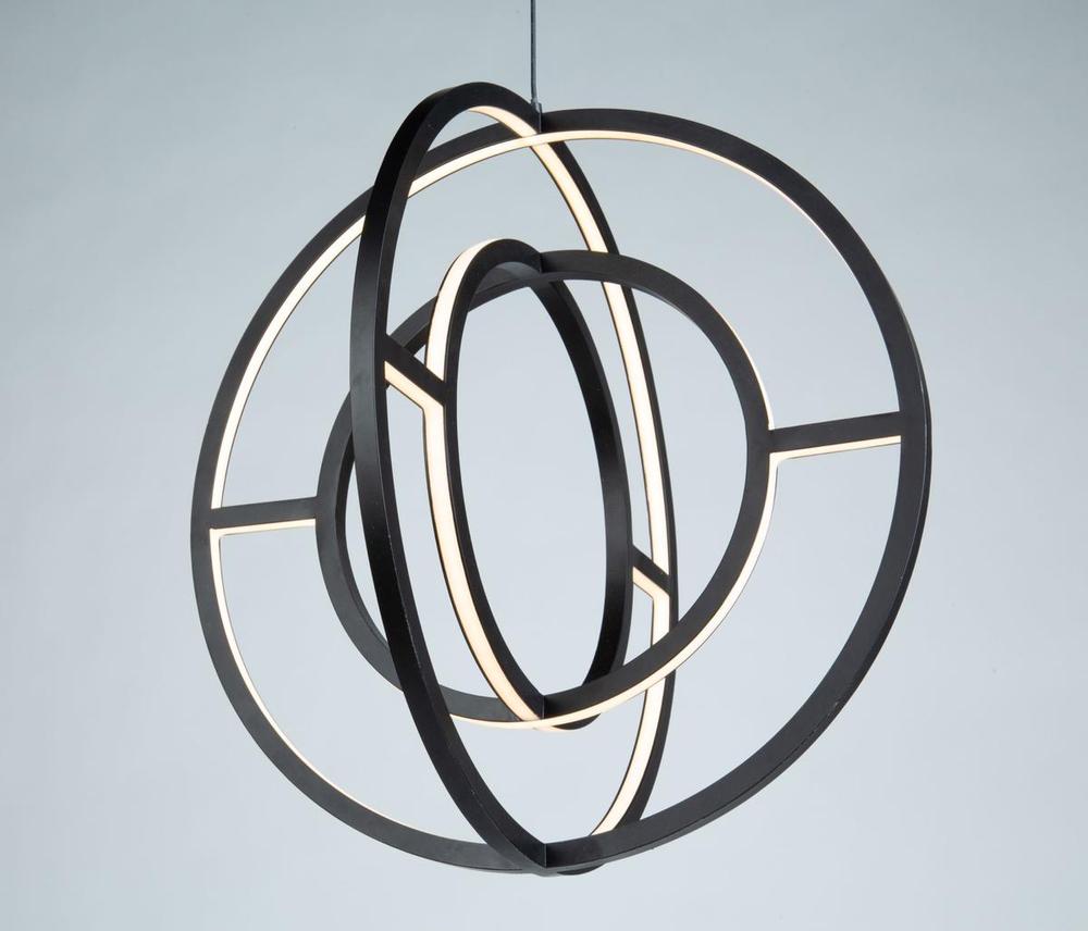 The "Celestial" collection double orb is truly unique and stylish. The matte black finish on this double frame is eye catching. Illuminated by bright energy efficient integrated LED, this chandelier would fit in any surrounding, especially in transitional to contemporary settings. Smaller 16" size also available.